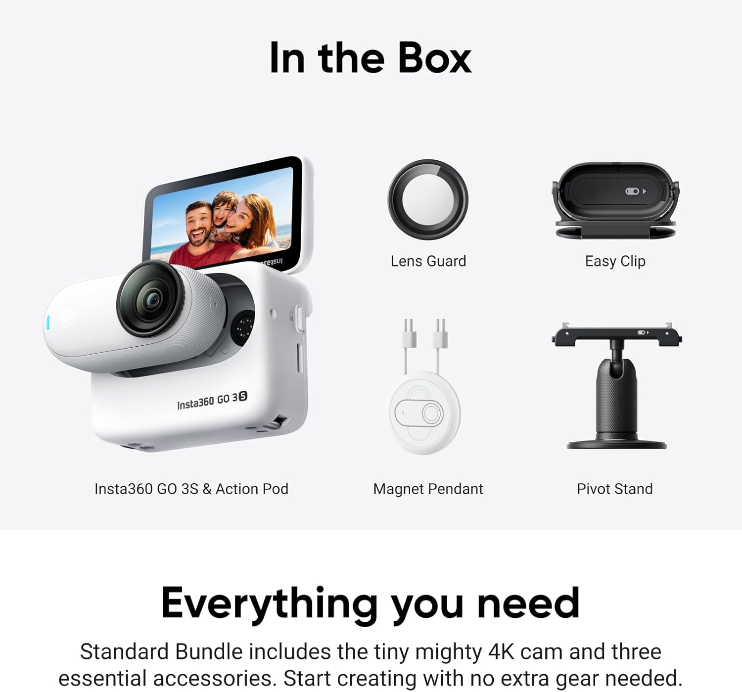 - Das Standard-Bundle enthält 1x GO 3S (128 GB), 1x Linsenschutz (standardmässig bereits am Objektiv angebracht), 1x Action Pod, 1x Magnet-Anhänger, 1x Drehhalterung und 1x Easy Clip.