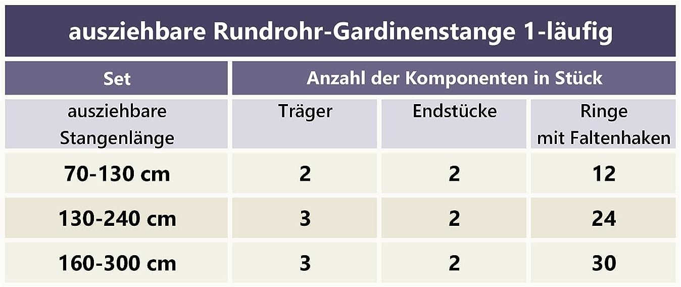 - 1-läufige Ausführung in 70-120 cm Länge (stufenlos ausziehbar)