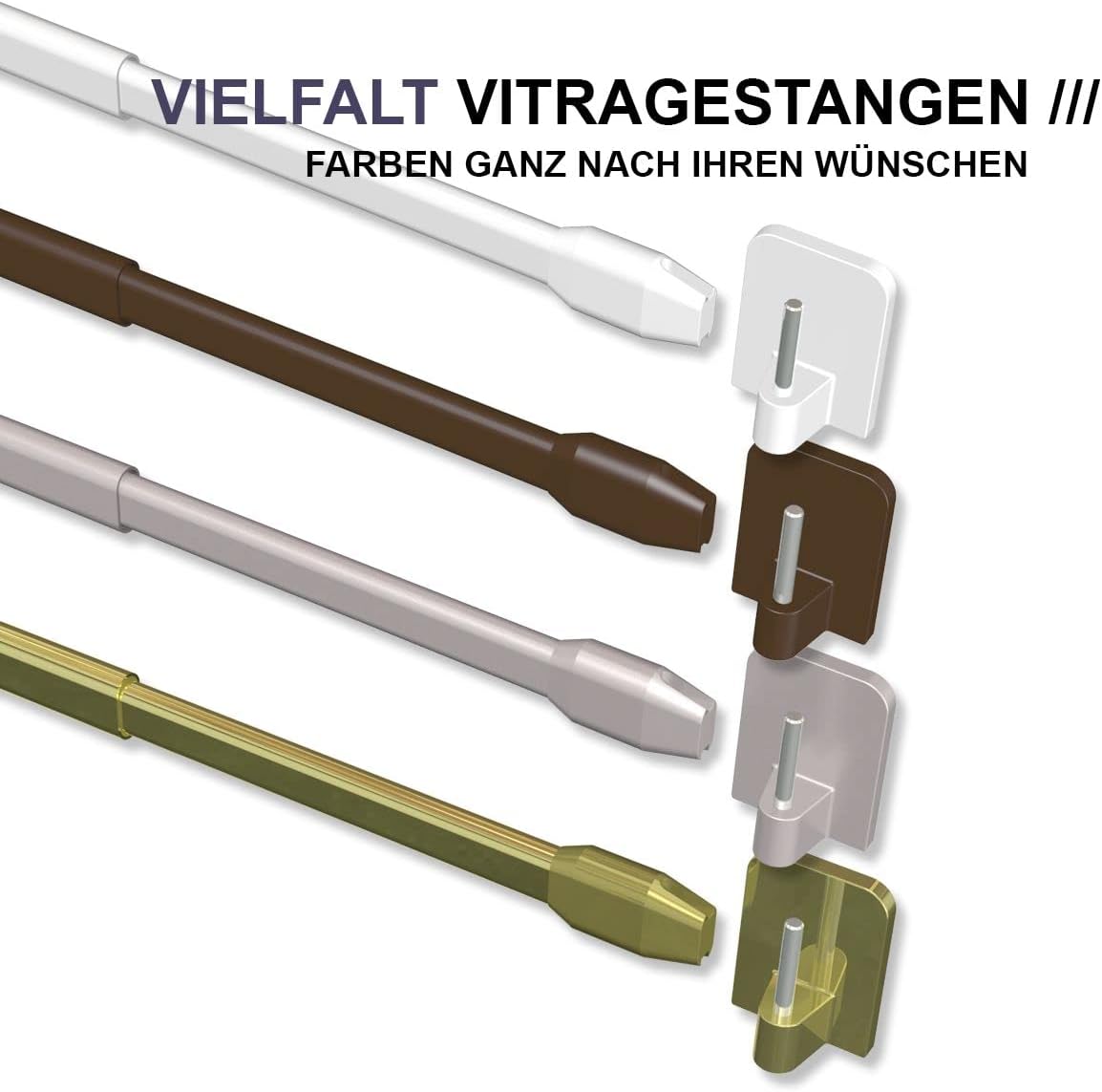 - Lieferumfang: 8 Stück Vitragestangen mit Klebehaken und Schraubhaken / Verwendung: Zum Anbringen leichter Scheibengardinen / Kurzgardinen