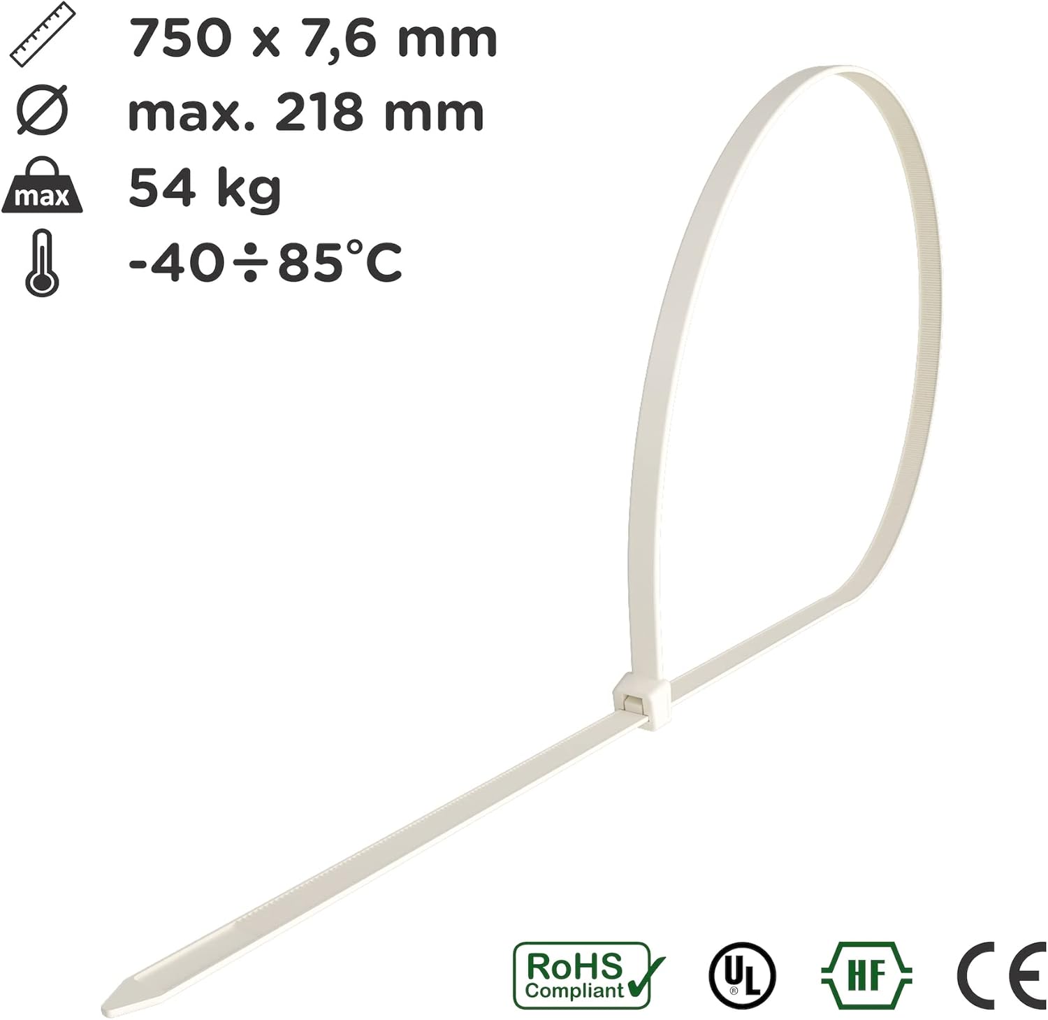 - 100 Stück Kabelbinder von intervisio, masse 750 mm x 7,6 mm weiss, Zugkraft 54 kg, Max. Bündeldurchmesser 218mm;