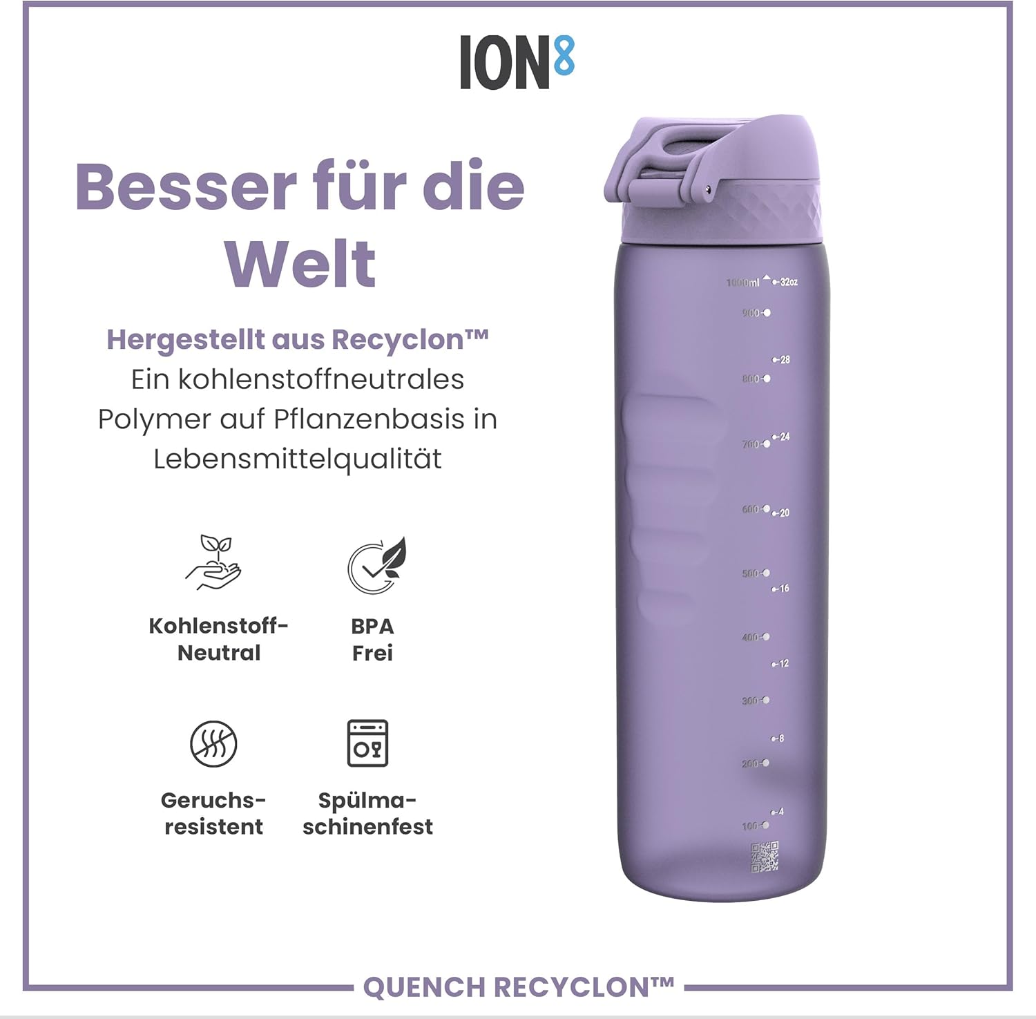 - 💧 Erleben Sie die Ion8 Auslaufsichere Trinkflasche, ein 1-Liter-Hygienebegleiter, der perfekt zu Ihrem aktiven Lebensstil passt. Diese Flasche ist nicht nur ästhetisch ansprechend, sondern bietet auch eine 100%ige Auslaufgarantie. Mit einem
