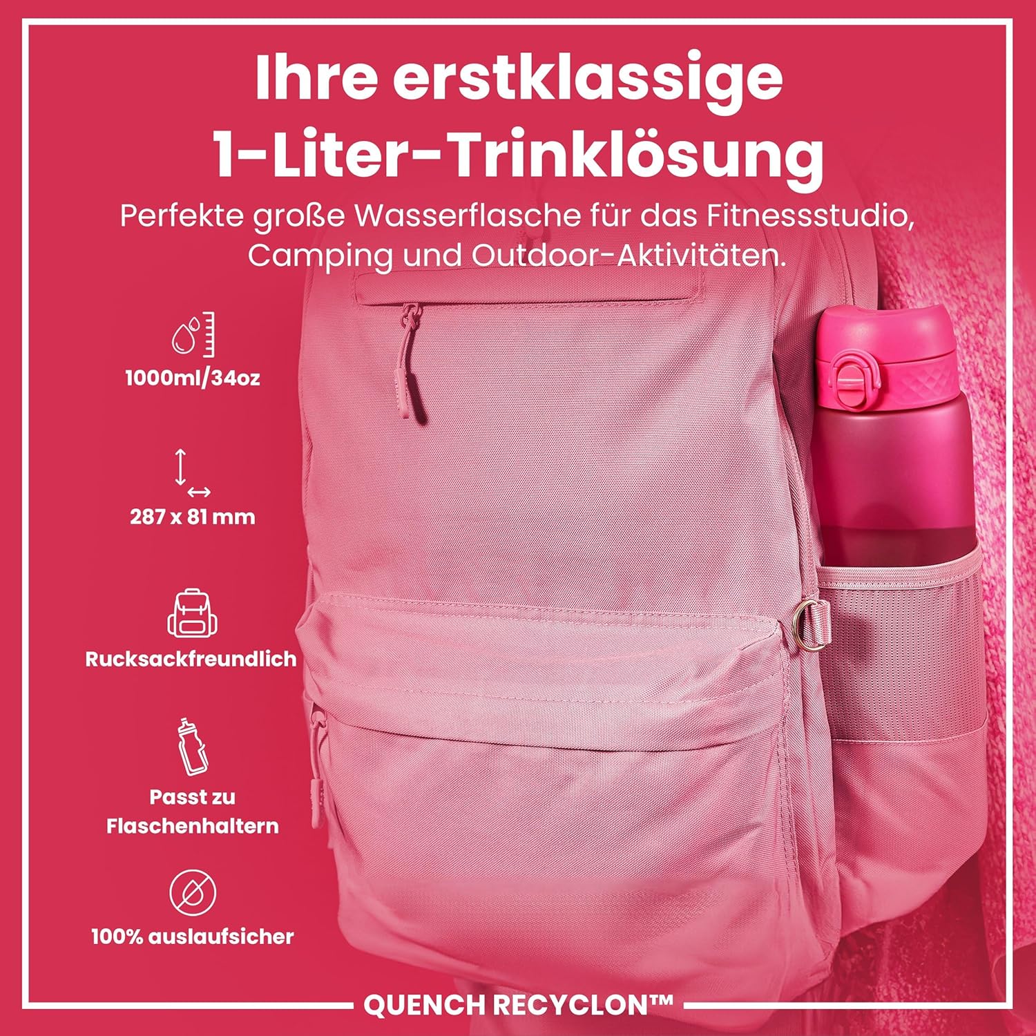 Ion8 1 Liter Trinkflasche, 1000ml, Auslaufsicher, Einhandöffnung, Sichere Verriegelung, Spülmaschine