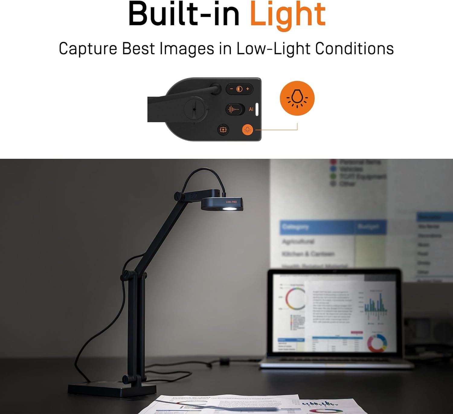 • 120°-Weitwinkelobjektiv mit Tabloid-Aufnahmebereich: Erfassen Sie mühelos umfangreiche Bilder mit dem Weitwinkelobjektiv und dem verstellbaren Arm, perfekt für die Anzeige von Dokumenten in Tabloidgrösse und grösseren Objekten oder als vielseitige