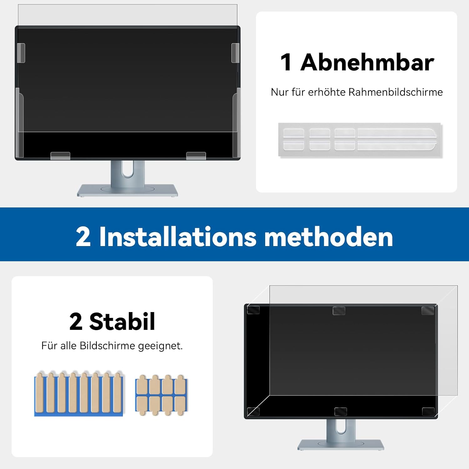 - 【Umkehrbar matt/glänzend】: Der monitor 21.5 zoll blickschutzfilter kann in 10 Sekunden fertiggestellt werden. Zwei Installationsmethoden ① nicht entfernbare Klebestreifen, passend für alle Monitore ② Abnehmbare Schiebehalterungslaschen, nur