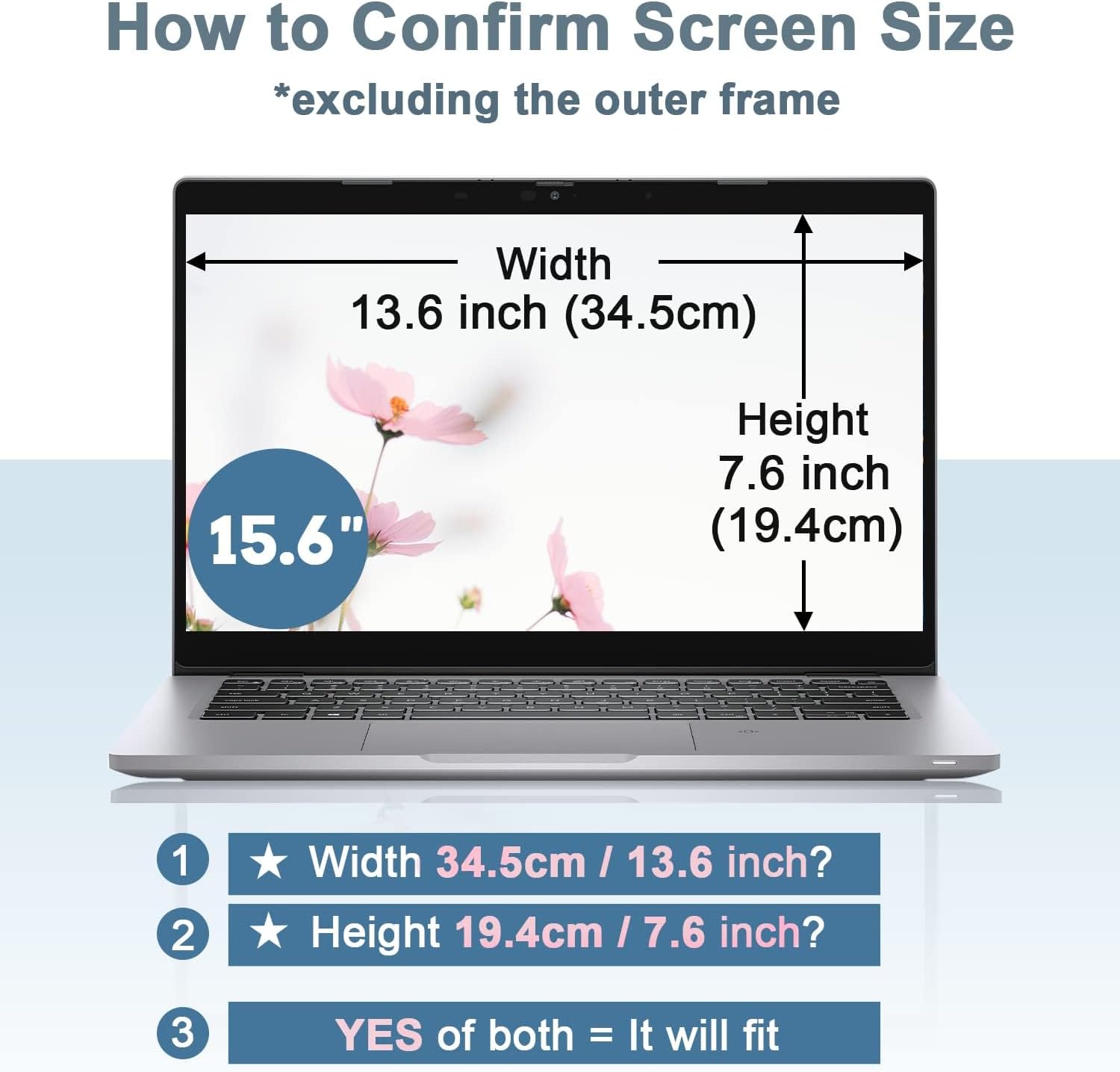 - 【Kompatibilität】 Passend für alle Laptop 15.6 screen protector mit einem Seitenverhältnis von 16:9, Abmessungen des Datenschutzfilters:Breite: 13 9/16 Zoll (13,6 Zoll/345 mm), Höhe: 7 5/8 Zoll (7,6 Zoll/194 mm), Diagonale: 15,6 Zoll (396,24 mm),