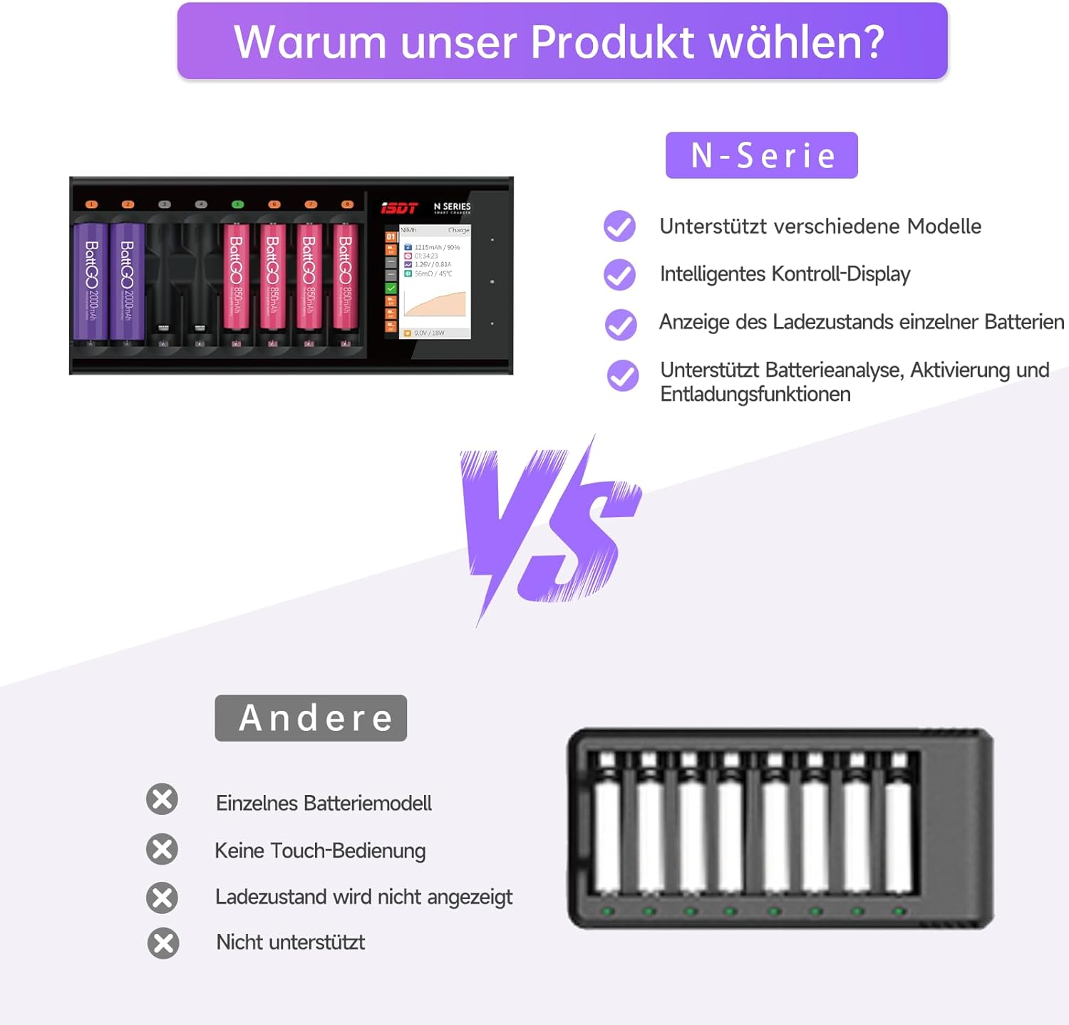 - Intelligentes Ladegerät: Kompatibilität mit mehreren Akkutypen All-in-One-Steuerung für Li-Ion, Li-HV, Li-Fe, NiMH, NiCd und NiZn-Akkus Automatische Erkennung des Akkutyps und intelligente Anpassung des Ladealgorithmus.