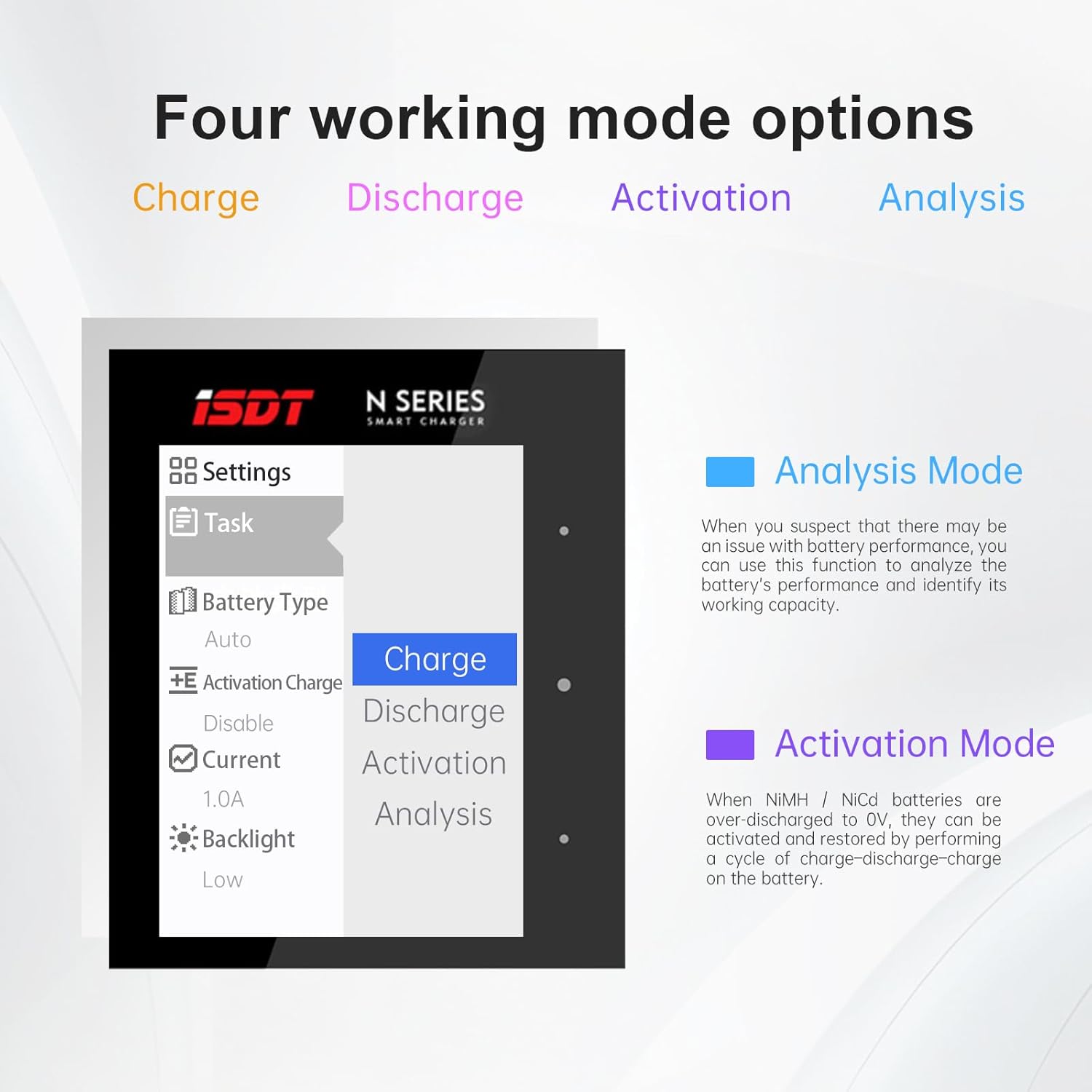- Professioneller Arbeitsmodus: Das N8-Ladegerät verfügt über Ladezyklus-, Aktivierungs-, Entlade- und andere Funktionen, um Ihre Bedürfnisse für eine Reihe von Funktionen zu erfüllen, wie z. B. das Laden und Entladen von Batterien, Leistungsabfrage,