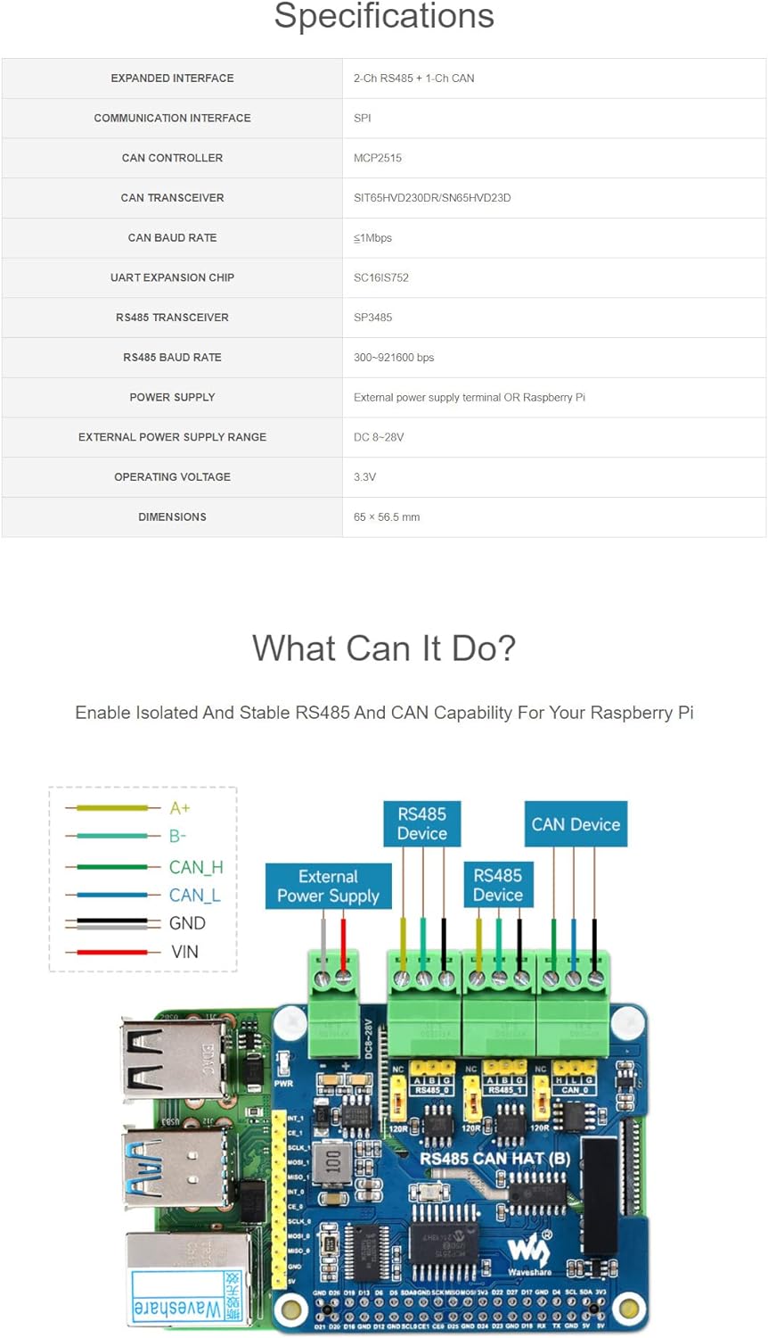- 2-Ch RS485, adopts SC16IS752+SP3485 dual-chip combination, converts SPI to RS485