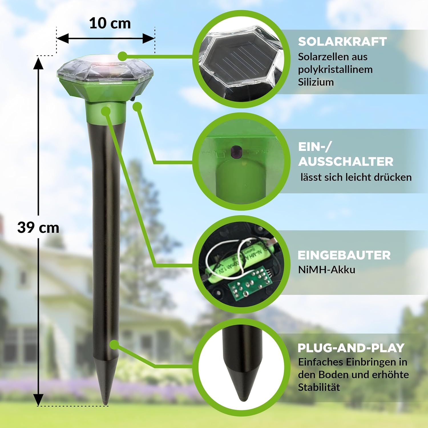 - VIELSEITIG EINSETZBAR: Ob auf Feldern, Äckern oder im Garten – Bodentiere können in vielen Bereichen ein Ärgernis darstellen sein. Unsere Tierabwehr-Geräte können dank stabilem Kunststoffstab auch in harte, trockene Böden gesteckt werden