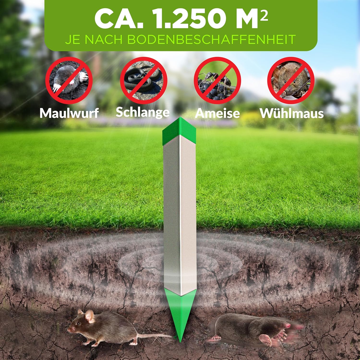 - SCHUTZ VOR BODENTIEREN: Unsere Abschreckung schützt effektiv vor Tieren wie Maulwürfe, Wühlmäuse, Spitzmäuse, Feldmäuse, Ameisen und Schlangen. Das Gerät sendet Quarzschwingungen zwischen 400 - 1000 Hz im Intervall, damit der Gewöhnungseffekt