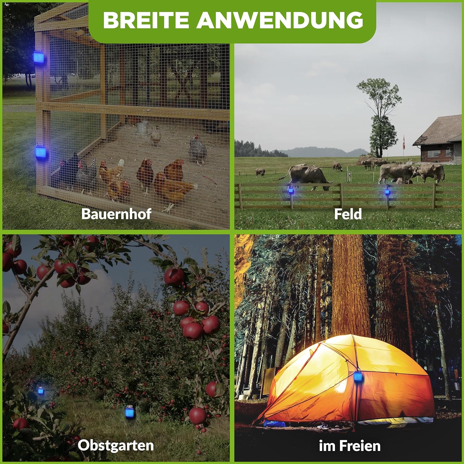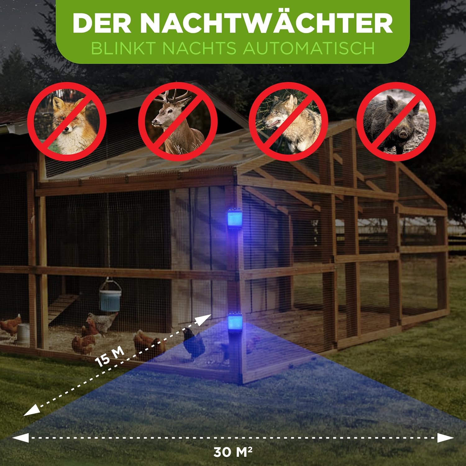 - NATÜRLICHE DAUERHAFTE SPERRE : Das Gerät sendet nachts und während der Dämmerung automatisch eine Lichtsequenz aus (3x blau gegen Wildtiere)
