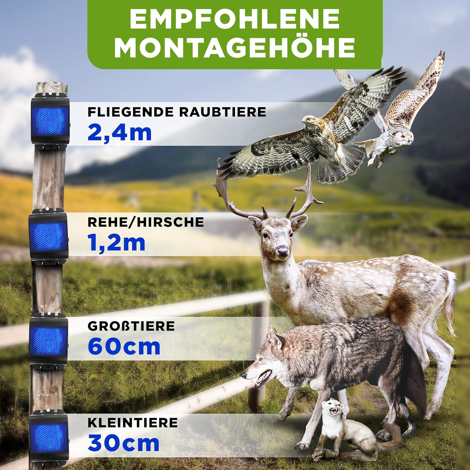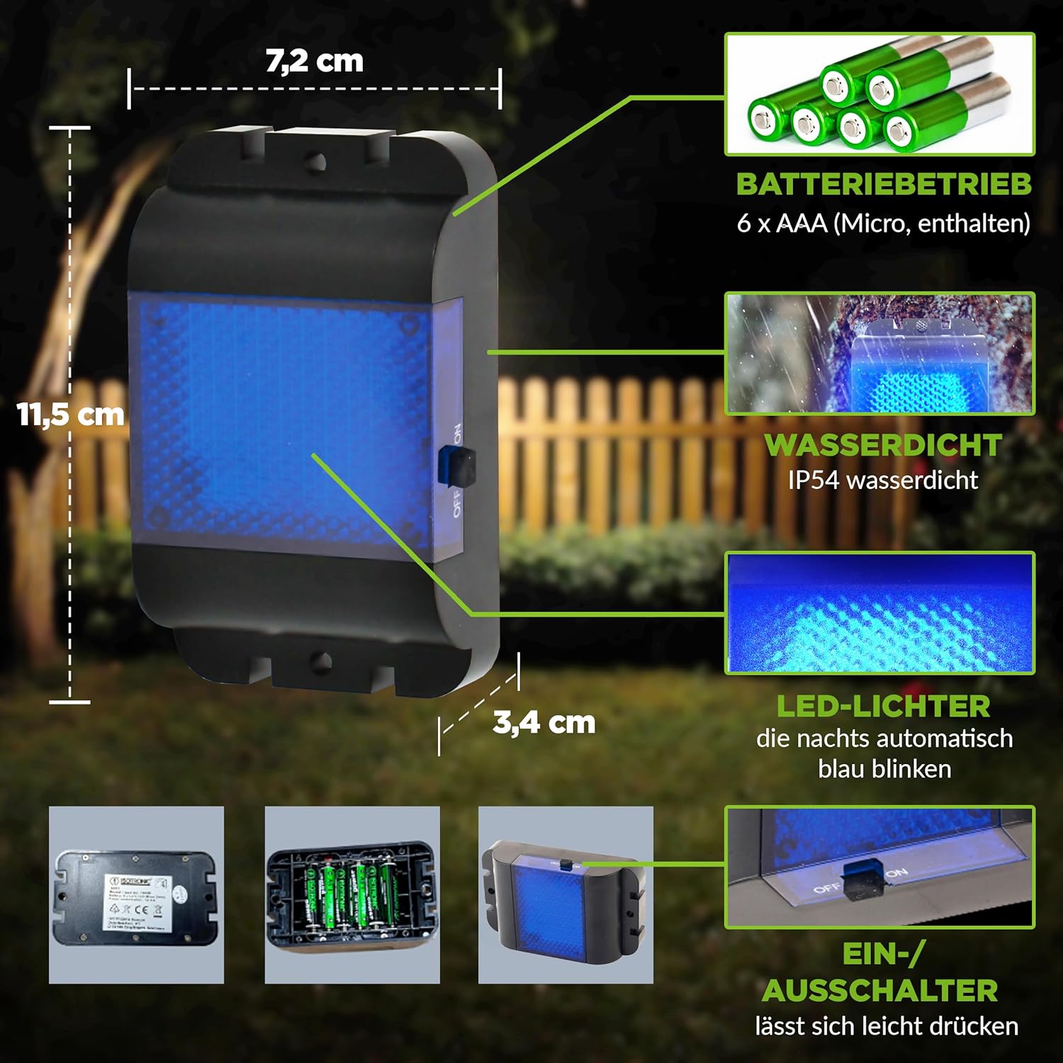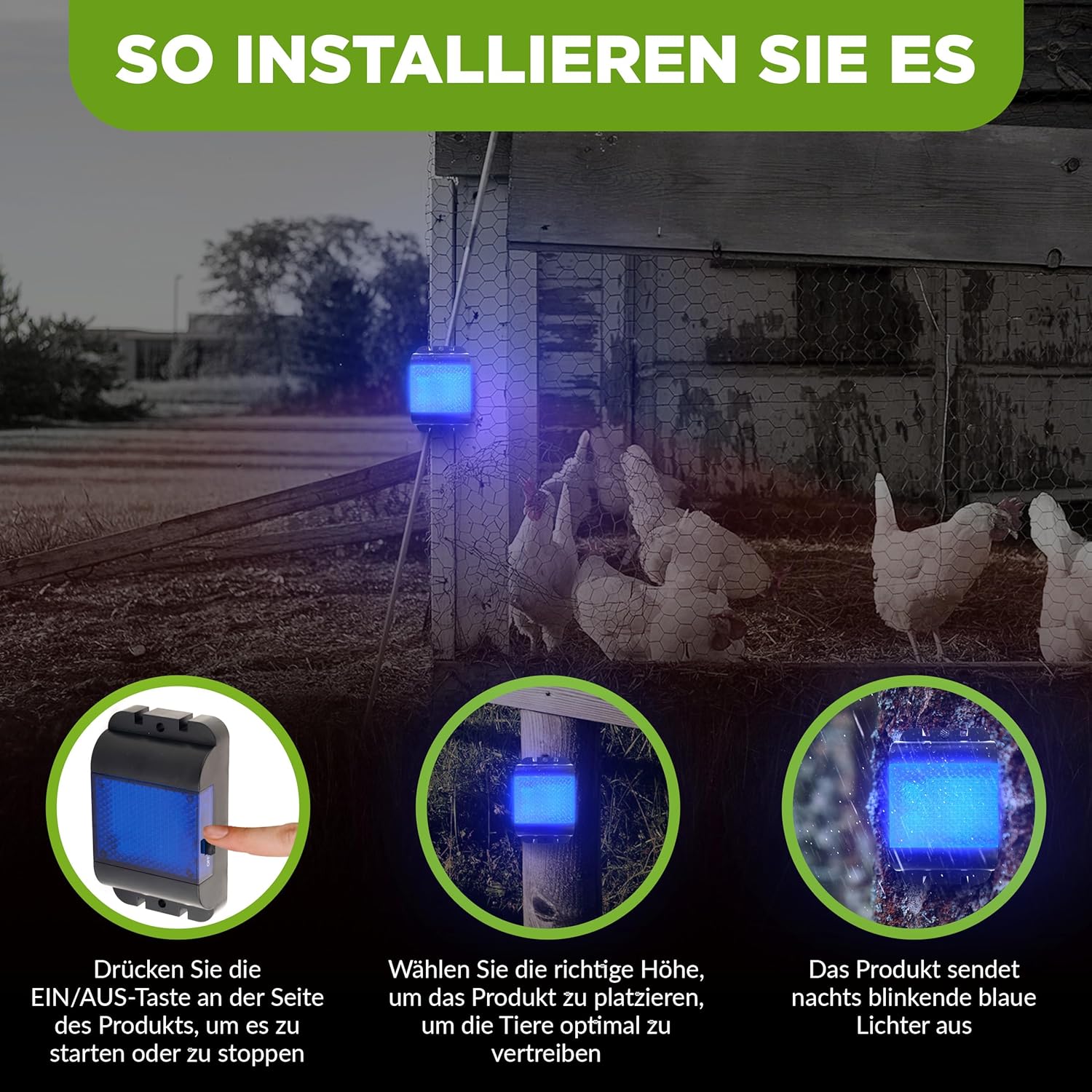 • NATÜRLICHE DAUERHAFTE SPERRE : Das Gerät sendet nachts und während der Dämmerung automatisch eine Lichtsequenz aus (3x blau gegen Wildtiere)