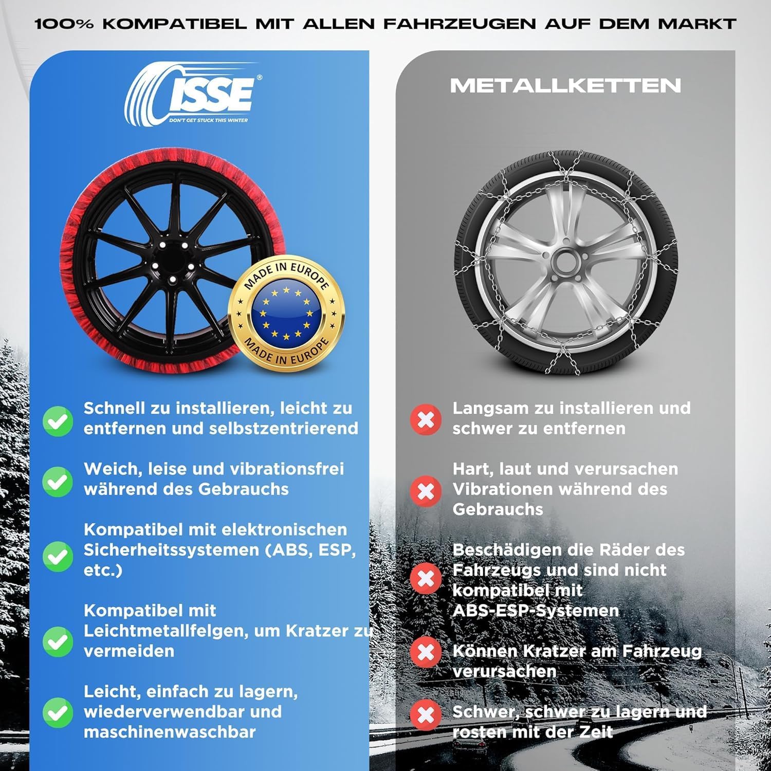 - Superleise Textilschneeketten dank Null-Vibration. Nur auf verschneiten oder vereisten Strassen verwenden. Waschbar bei einer Temperatur von 30°C. Kompatibel mit ABS und ESP und auch für 4x4-Fahrzeuge, Transporter und Nutzfahrzeuge geeignet. Maximale