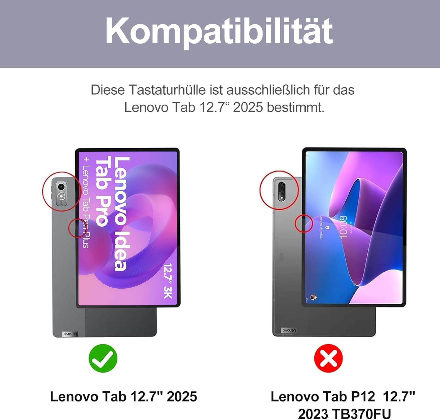 - Kompatibilität: Dieses tastatur hülle ist speziell massgeschneidert für Lenovo idea Tab Pro 12.7 Zoll 2025 (TB-375FC/TB-373FU). Nicht kompatibel mit Lenovo Tab P12 12.7" 2023, bitte bestätigen Sie Ihr Tablet-Modell vor der Bestellung.