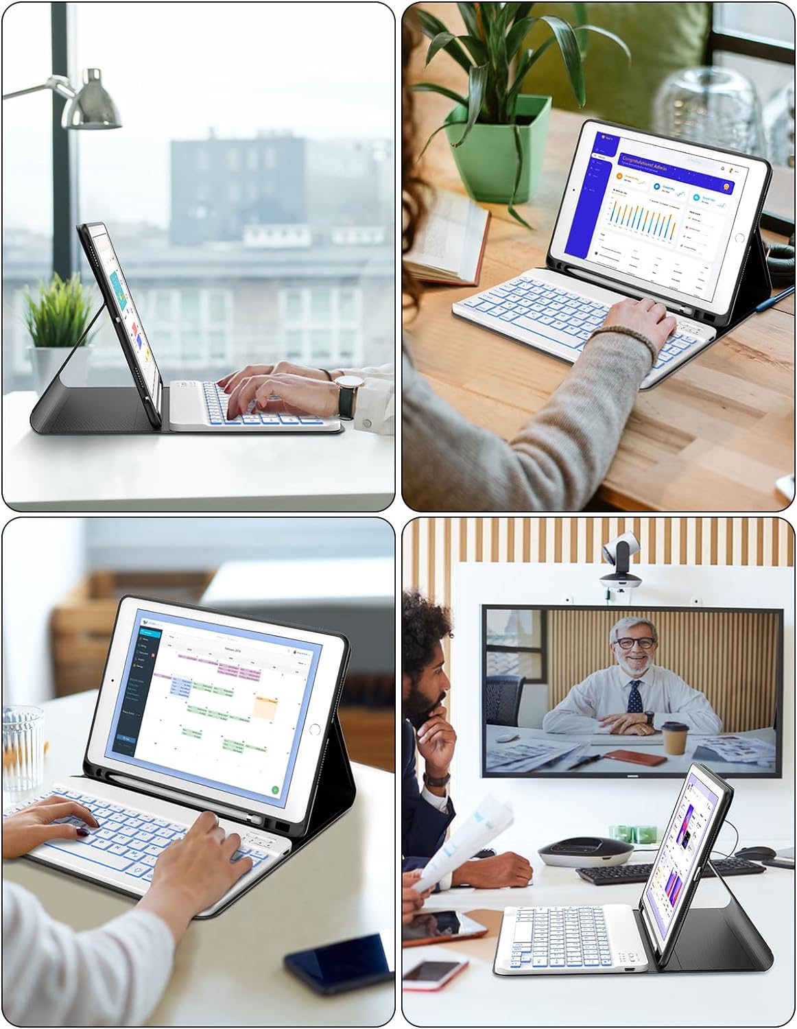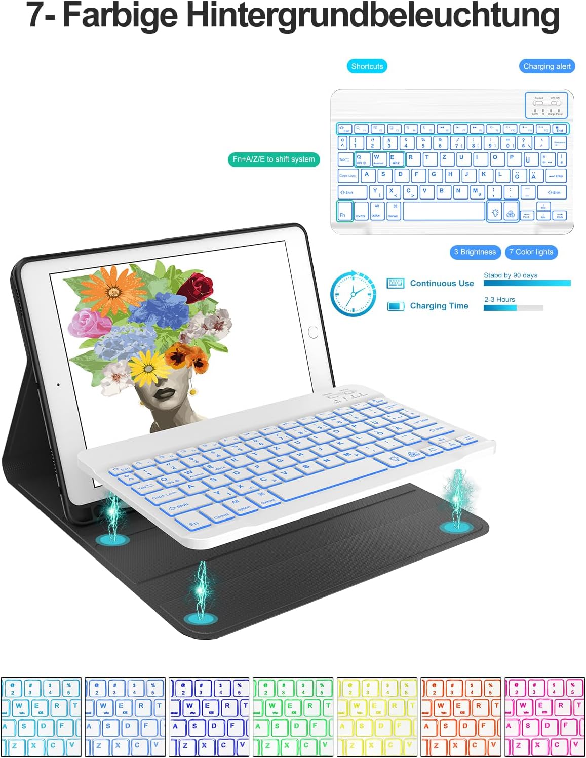 - 【Bunte Hintergrundbeleuchtungsfunktion】: Die IVEOPPE iPad 9 Generation Tastatur verfügt über eine Hintergrundbeleuchtungsfunktion. Die Tastatur kann insgesamt 7 Hintergrundbeleuchtungsfarben und 3 Arten von Helligkeit einstellen, wodurch Sie auch