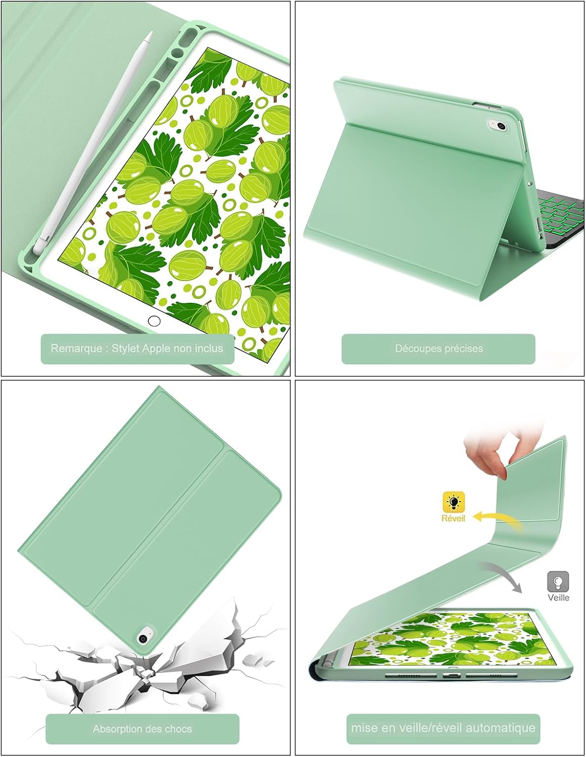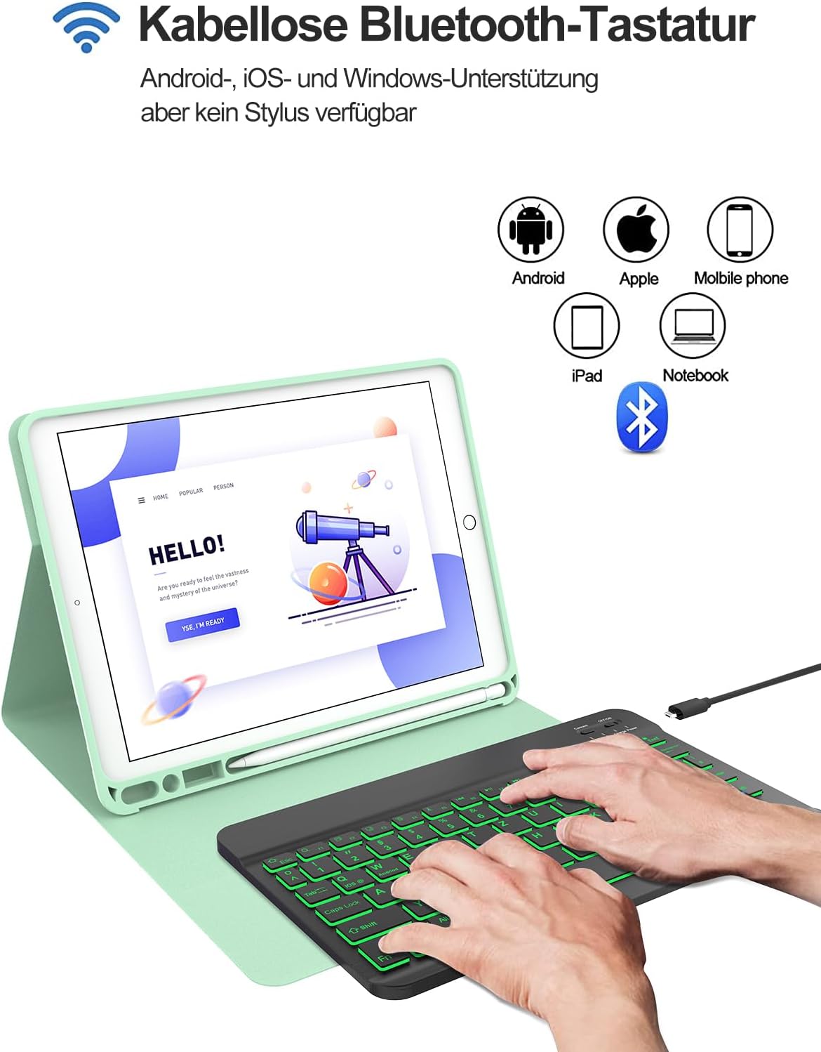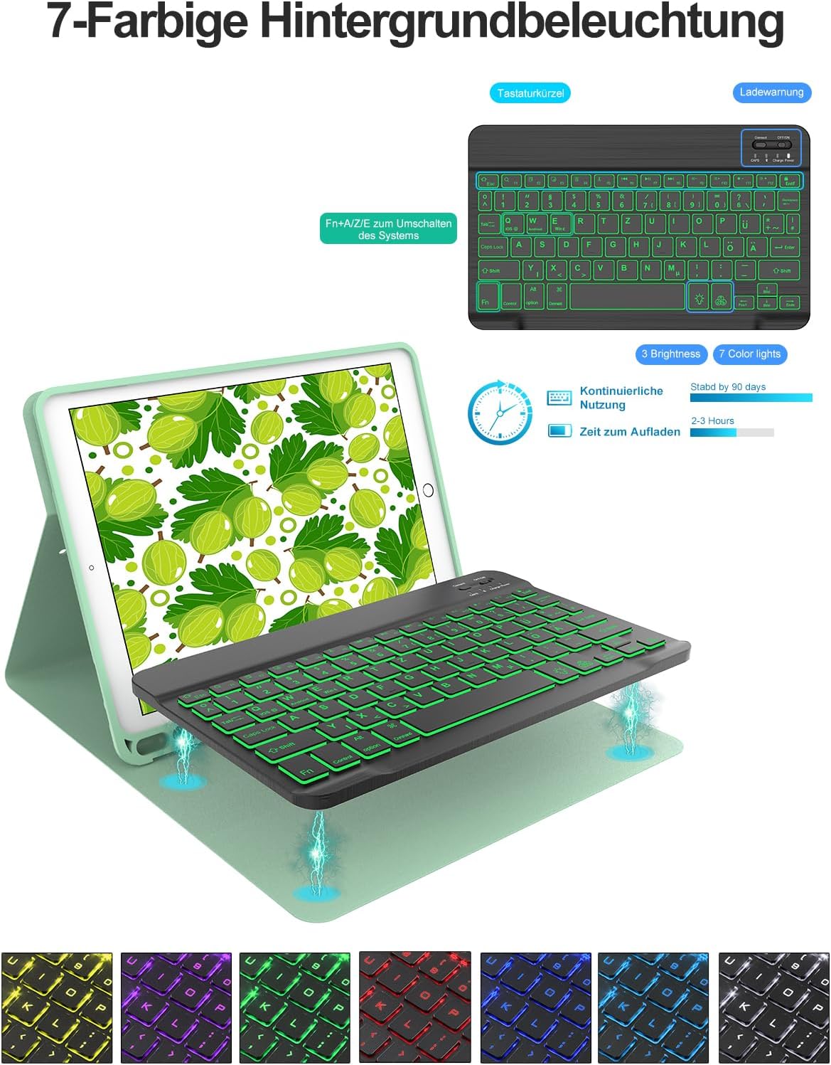 - 【Bunte Hintergrundbeleuchtungsfunktion】: Die IVEOPPE iPad 9 Generation Tastatur verfügt über eine Hintergrundbeleuchtungsfunktion. Die Tastatur kann insgesamt 7 Hintergrundbeleuchtungsfarben und 3 Arten von Helligkeit einstellen, wodurch Sie auch