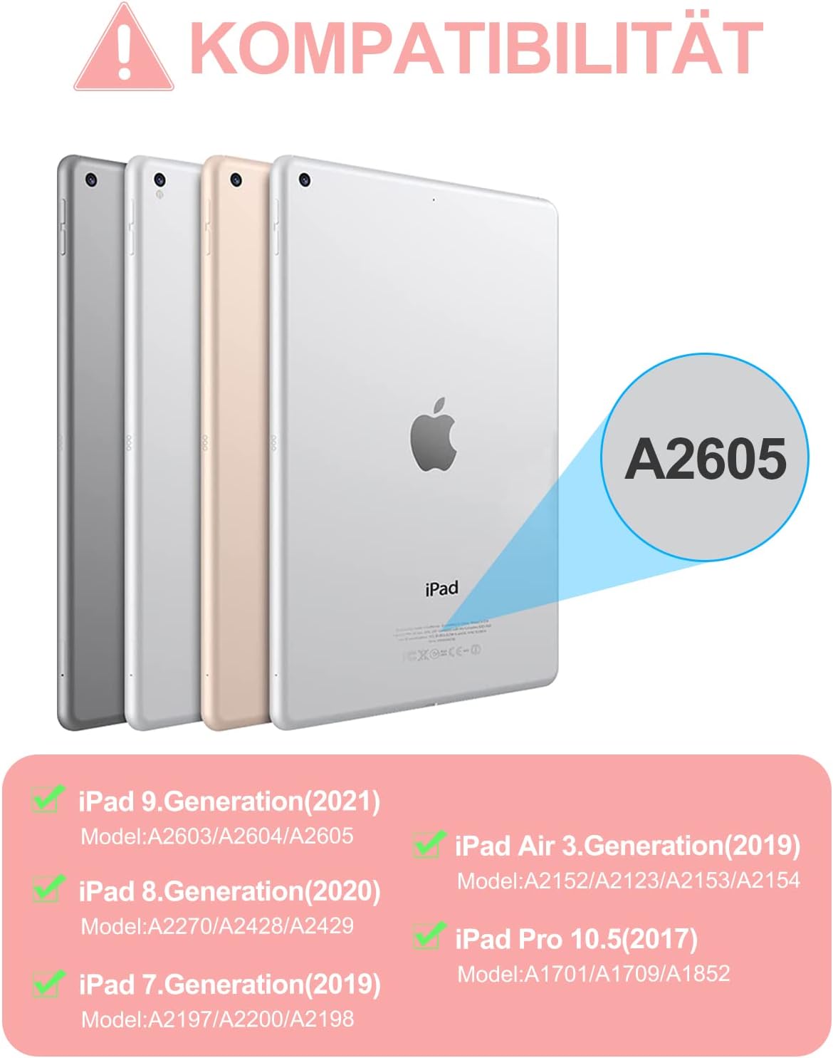 - 【Kompatibilität】: Diese iPad 10.2 Tastatur ist kompatibel mit iPad 9.Generation 2021(Modell:A2603/A2604/A2605), iPad 8.Generation 2020(Modell:A2270/A2428/A2429), iPad 7.Generation 2019 10,2 Zoll(Modell:A2197/A2200/A2198), iPad Pro 10.5