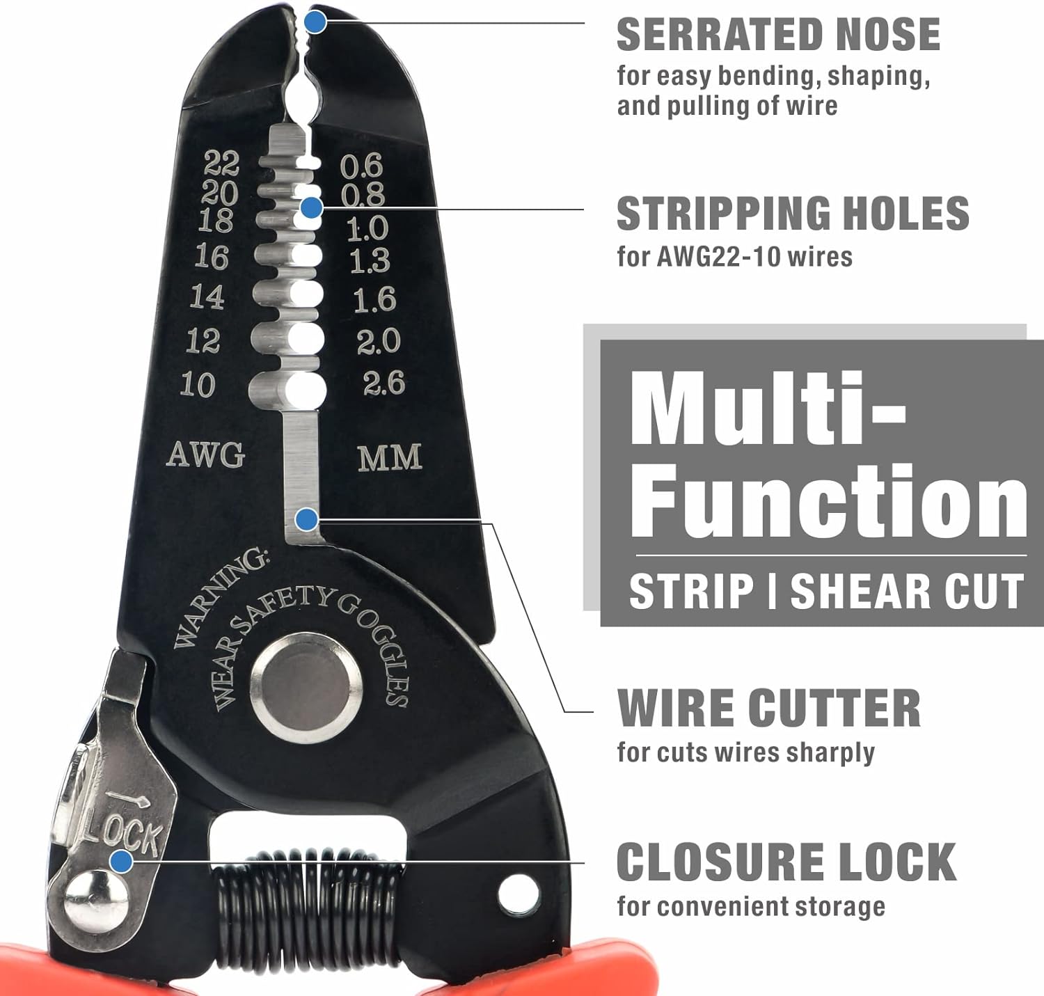 - 【ABISOLIERZANGE/SCHNEIDER】Abisolierzange mit sechs präzisionsgeschliffenen Abisolierlöchern für Massivdraht 8–18 AWG und Litzendraht 10–20 AWG. Scherenartige Klingen, die für saubere Schnitte sorgen. Das aktualisierte Schloss lässt sich