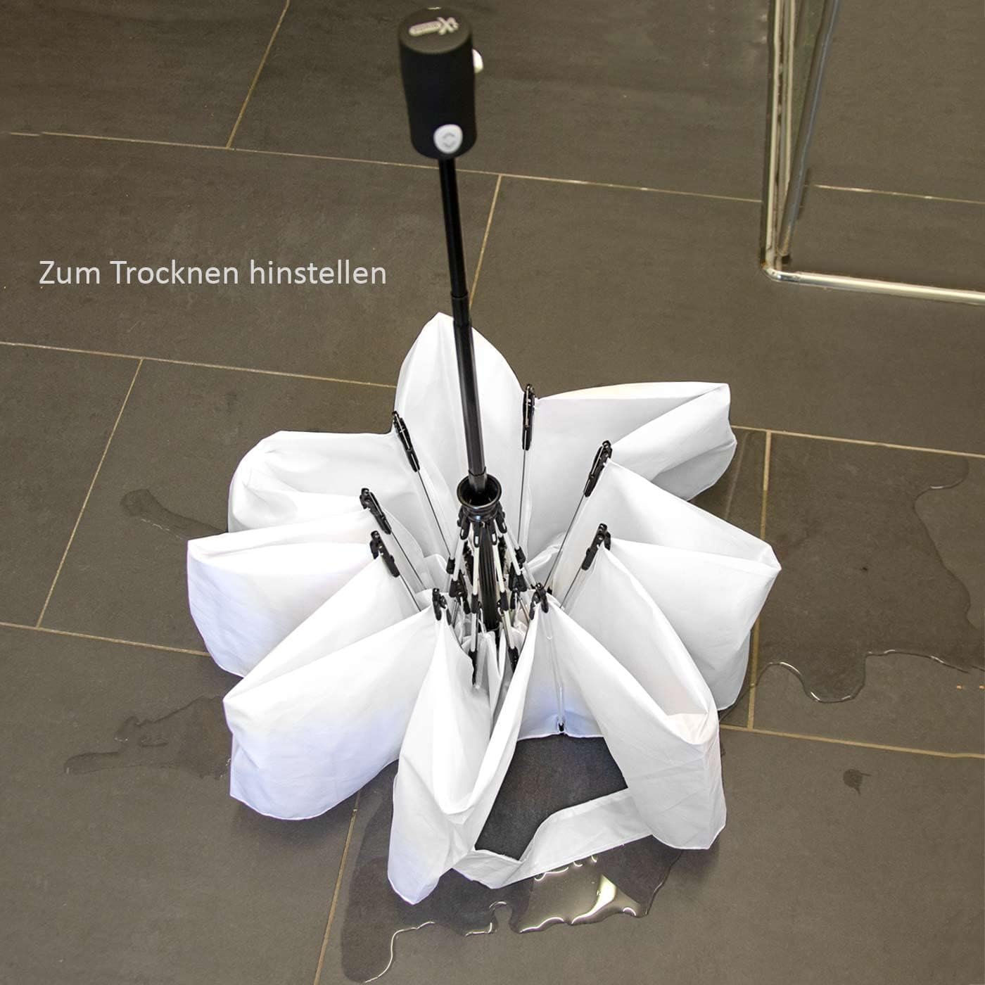 - Die nasse Seite des Regenschirms wird beim Schliessen nach innen geklappt. Dadurch wird man vom Schirm nicht nass getropft. Er kann dann platzsparend, geschlossen zum Trocknen aufgestellt werden.