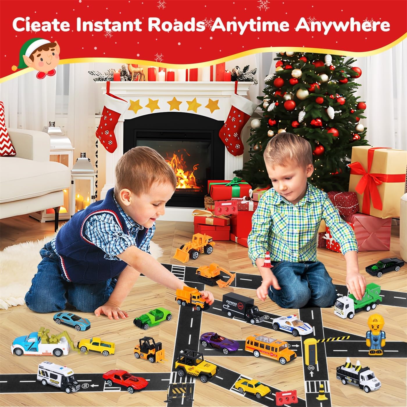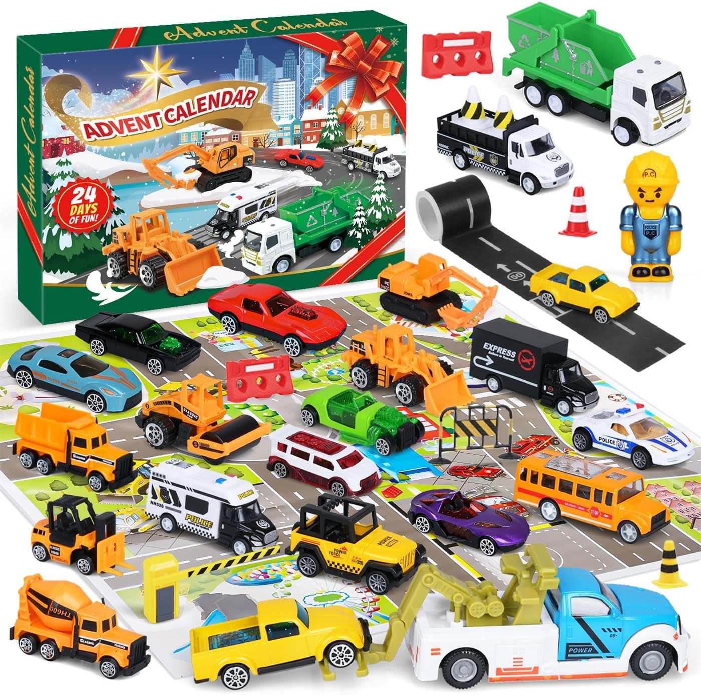 - Kinder-Adventskalender 2024 für Jungen: Fahrzeuge Geschenk Set enthältet ein Schwerlastwagen (kann das Auto ziehen),6 farbige Baufahrzeuge,2 Polizeiautos,2 SUV,1 Baufahrzeuge mit Strassensperren,1Müllwagen,1 Lieferwagen,1 Schulbus,3 Autos, 2