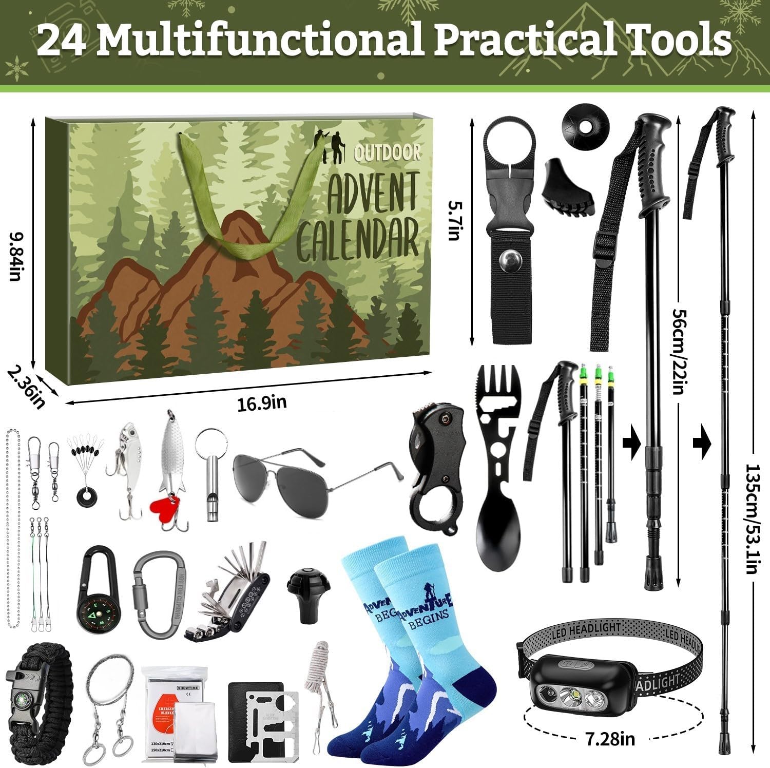 - Adventskalender Outdoors Camping Werkzeuge:Zählen Sie die Tage bis Weihnachten mit praktischer Outdoor-Ausrüstung für 24 Tage, darunter Trekkingstöcke, Sonnenbrillen, Socken, Säbelkarte, Karabinerhaken, Survival-Armband, Pfeife, Angelzubehör,
