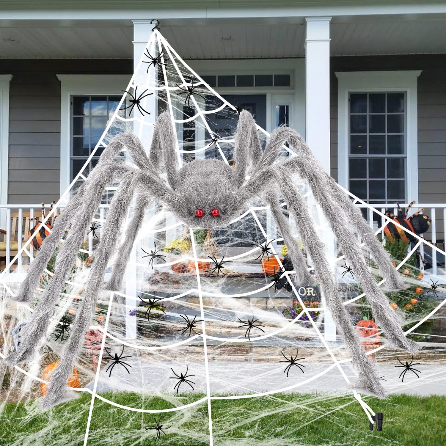 - Halloween Spinnen: Gruseliges Halloween Deko, der Körper ist mit Grauem Fell überzogen, während seine Augen rot leuchten, wirklich gruselig Realistische flauschige Seile lassen es genauso aussehen wie die echten Spinnennetze Lassen Sie Ihre Gäste