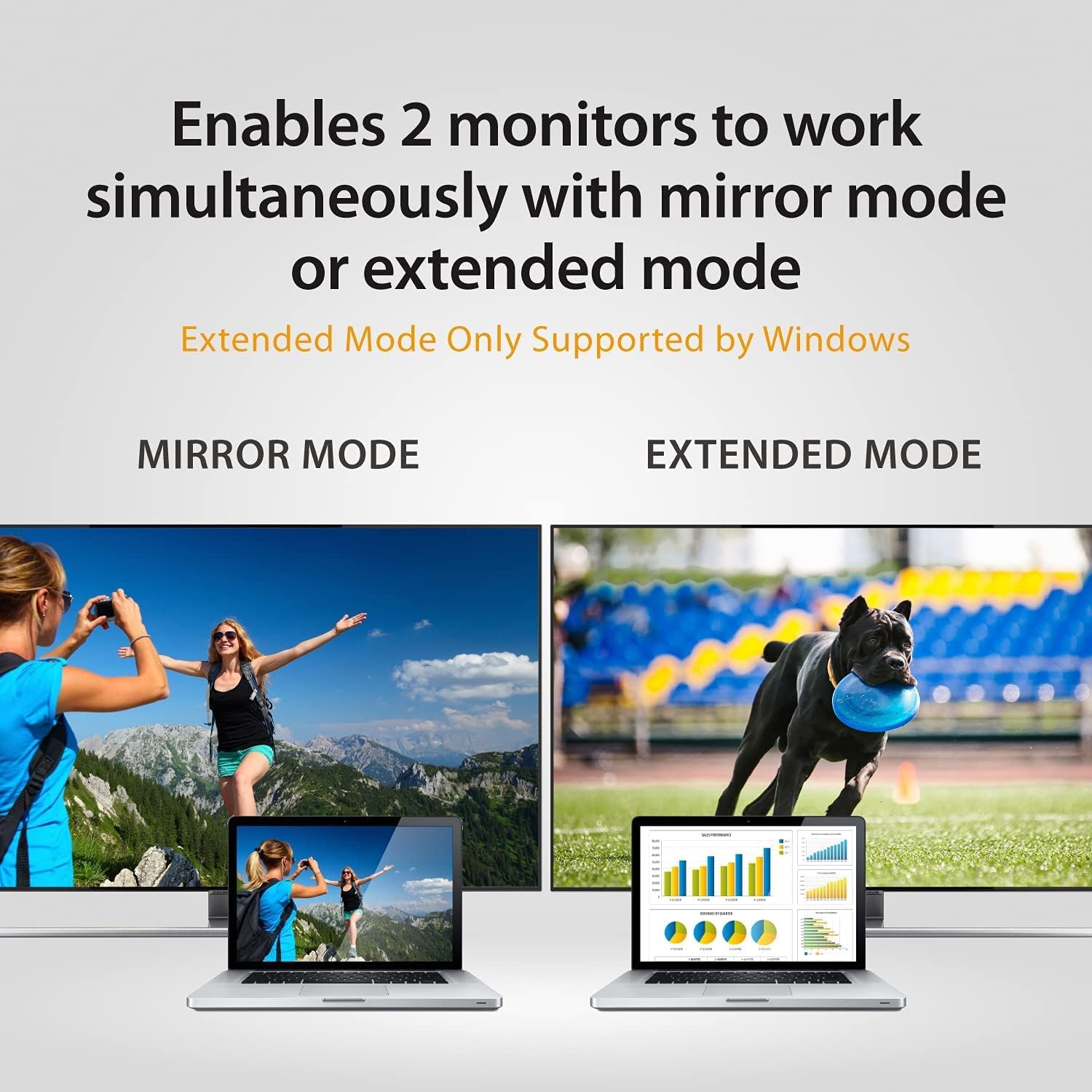 • Ermöglicht den gleichzeitigen Betrieb von 2 Monitoren im erweiterten Modus, im Expansionsmodus oder im Spiegelungsmodus. Hinweis: nicht kompatibel mit Mac