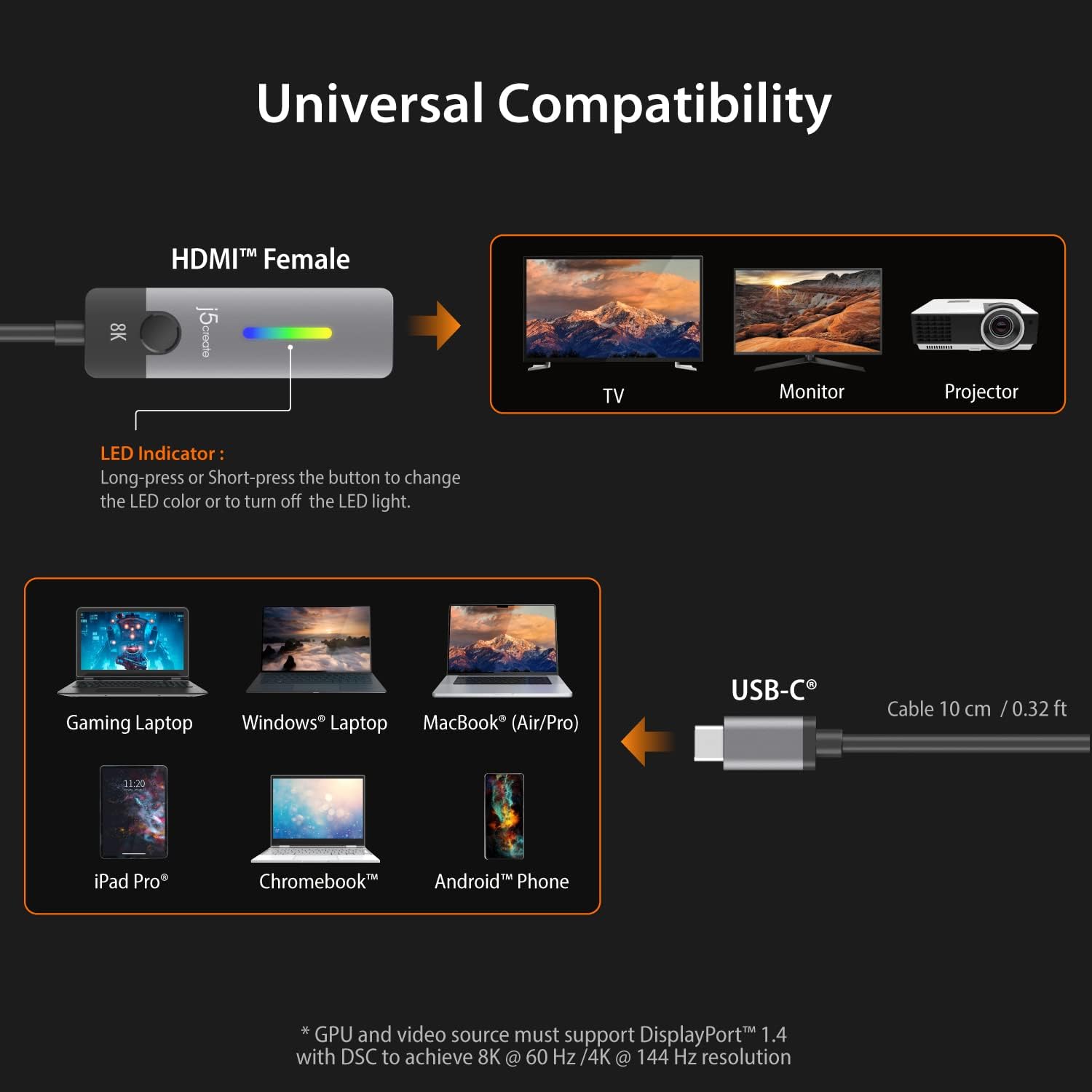 j5create USB Typ C zu HDMI Adapter (8K@60Hz, 4K@120Hz) mit RGB LED Licht für MacBook Pro, MacBook Ai