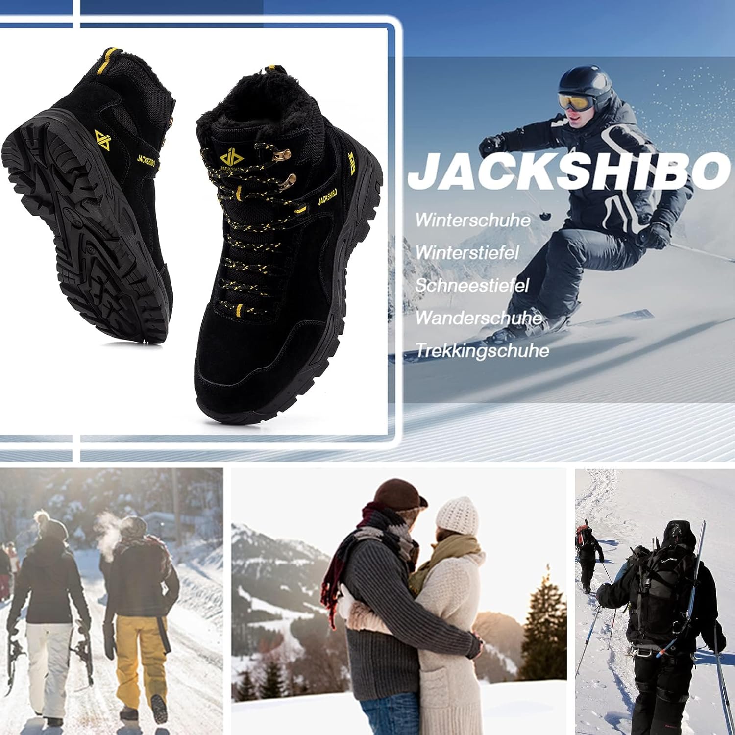 - Die Winterschuhe wurden mit einer plüschigen Innenausstattung und einem wasserdichten Futter ausgestattet. JACKSHIBO empfiehlt, die Schuhe eine Nummer grösser zu kaufen, damit sie noch bequemer sitzen.