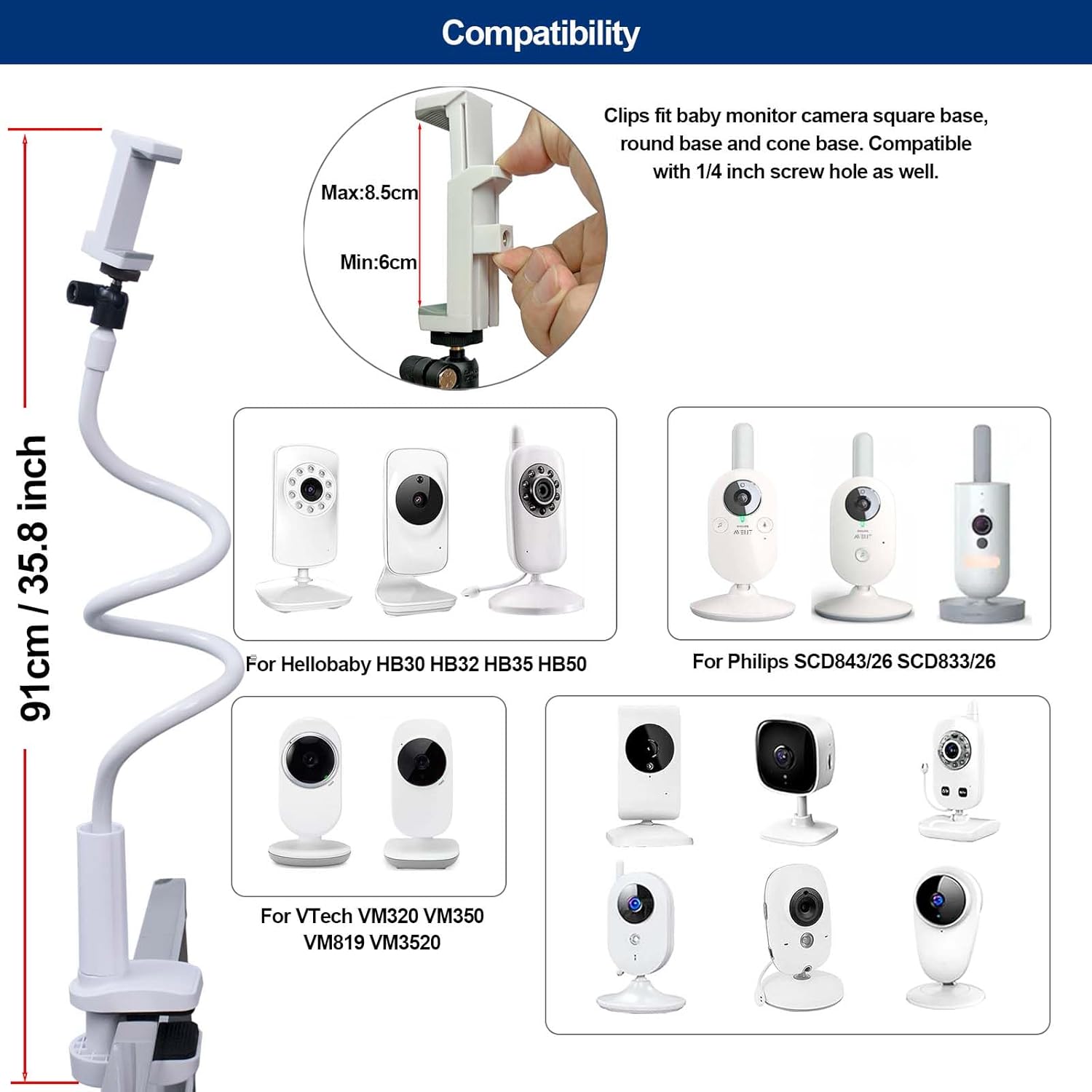 - Überall montierbar: Der flexible Schwanenhals-Ständer ist 32 Zoll lang und kann an Kinderbettgittern, Metallstangen oder jedem Schreibtischrand angebracht werden. Er kann an den meisten Babykameras verwendet werden und ist kompatibel mit Philips Avent