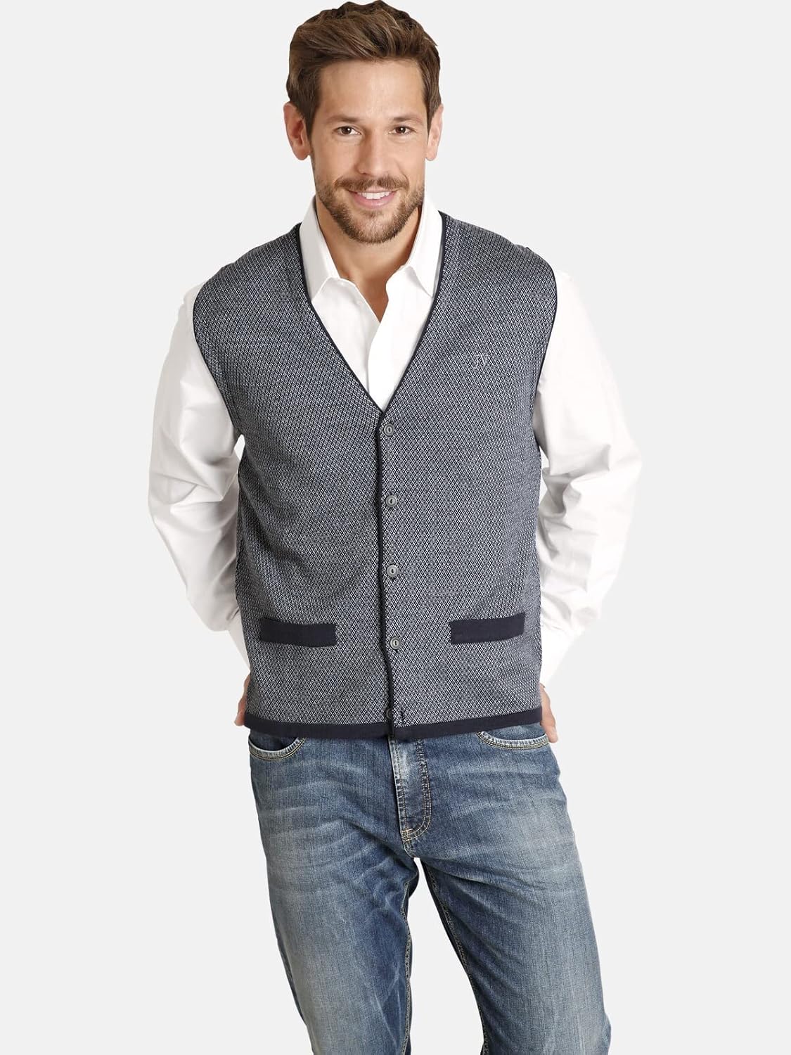 - Modisches Highlight: Die komplett gemusterte Strickweste für Herren in grossen Grössen ist in zweifarbigem Strickmuster ein echter Hingucker und sorgt für neue Outfitideen.