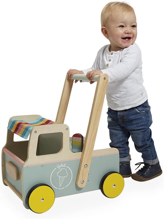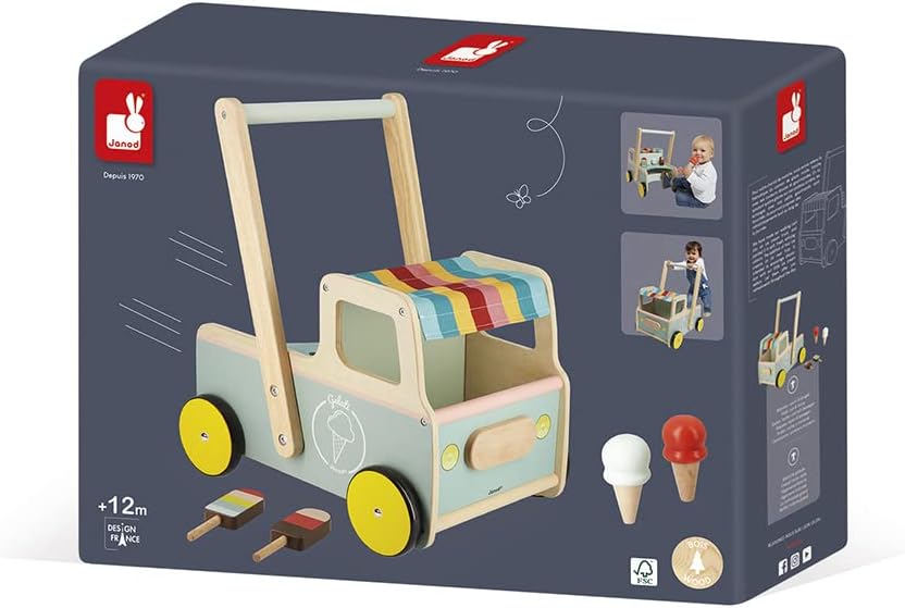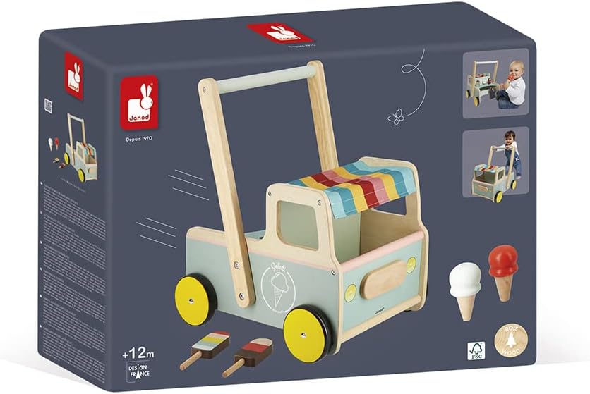 Janod - Eiswagen-Lauflernhilfe aus Holz - 4 Eissorten - Leise Räder - Kippschutzsystem - FSC-zertifi