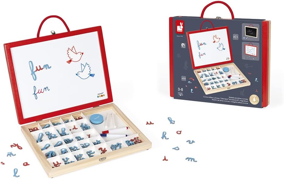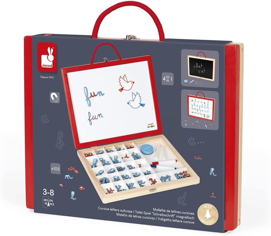 Janod - Essentiel - 4-in-1 Schreibkoffer aus Holz - Lernspiel - Buchstaben und Lesen lernen- 110 Zub