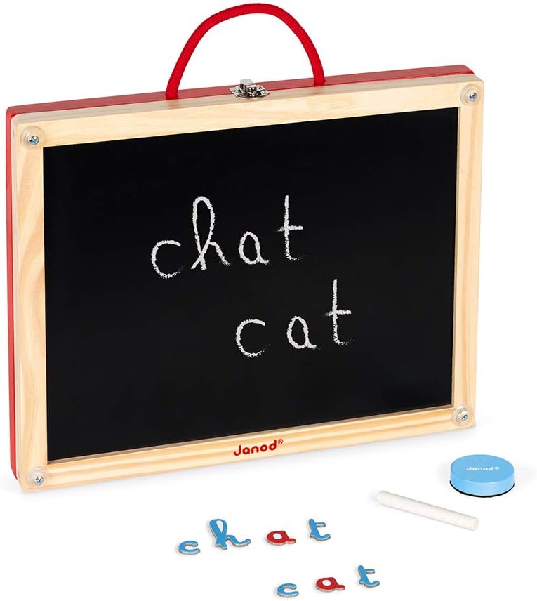 • MERKMALE : Der Koffer ist 37 cm hoch, 30 cm breit und 5 cm tief. Er enthält zahlreiche Zubehörteile (105 magnetische Akzente und Buchstaben aus dicker Pappe mit blauen Konsonanten und roten Vokalen, 1 blauer Filzstift, 1 roter Filzstift, 1 Bürste und