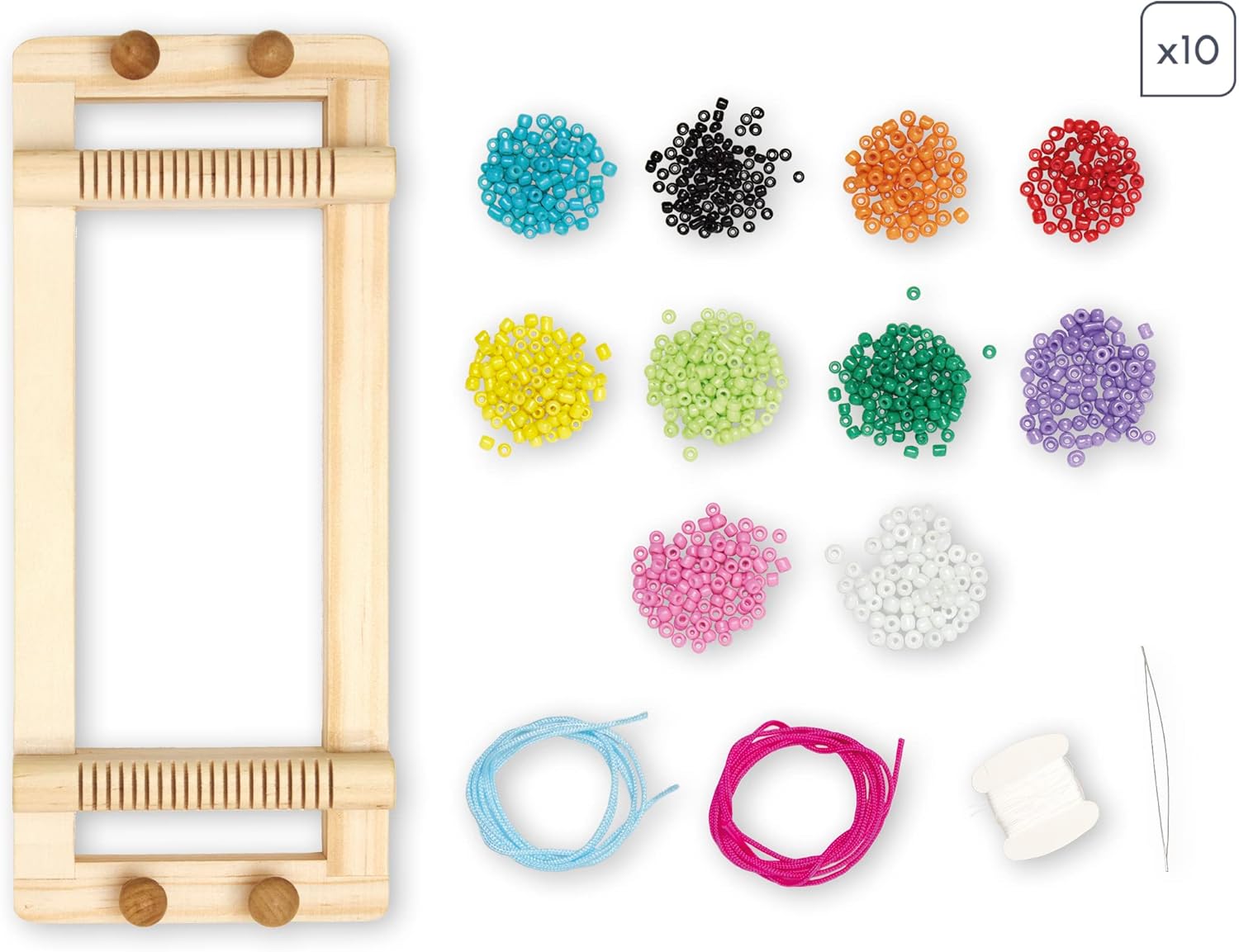 • UMFANGREICHES SET: 10 Röhren mit je 500 Bastelperlen (10 Farben), 2 Webnadeln, 1 Rolle weisser Faden, 7 m blaues Zwirn, 7 m rosa Zwirn, 1 Holzwebstuhl, 1 Heft mit Anleitungen. 1 Schmuckstück dauert ca. 2 h.
