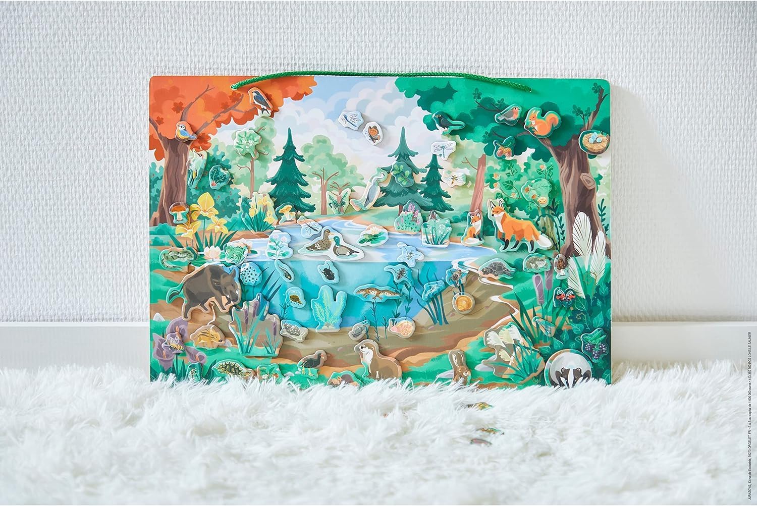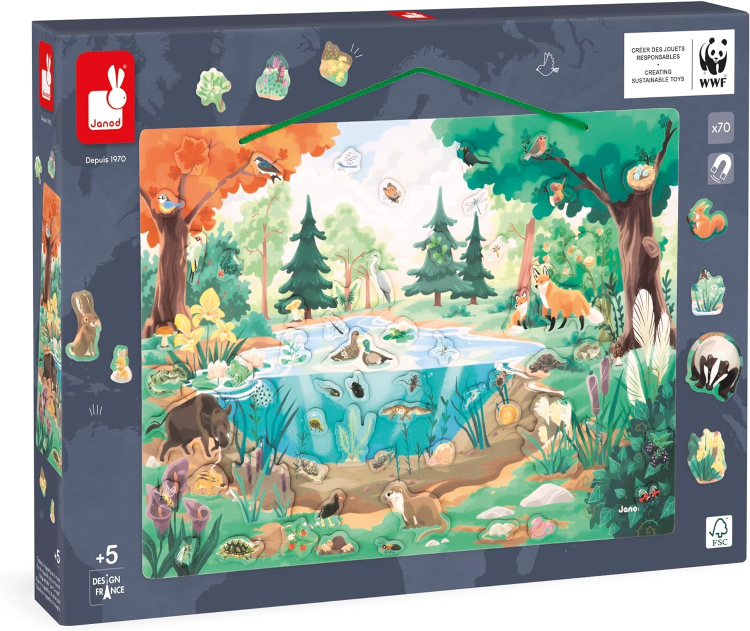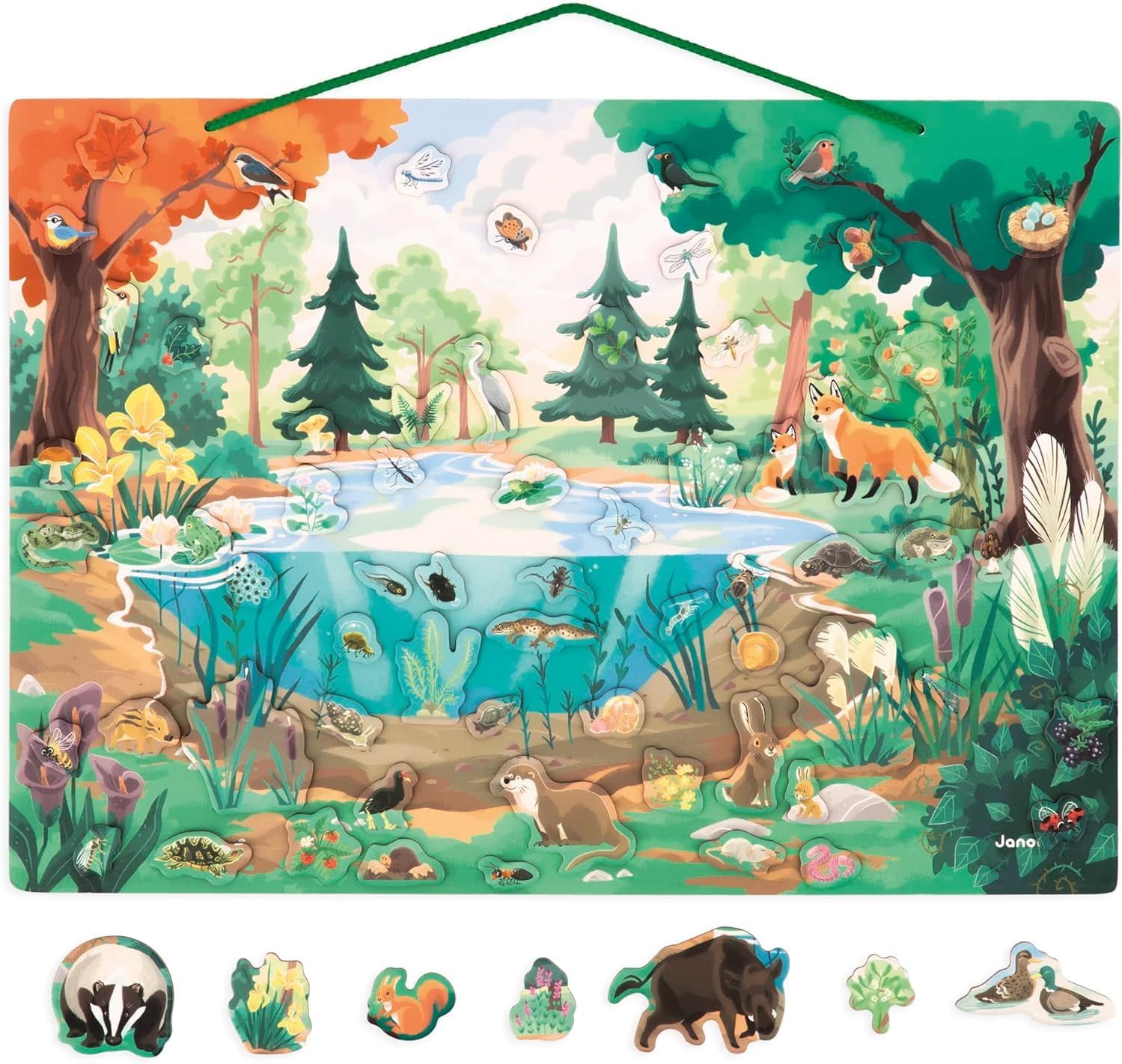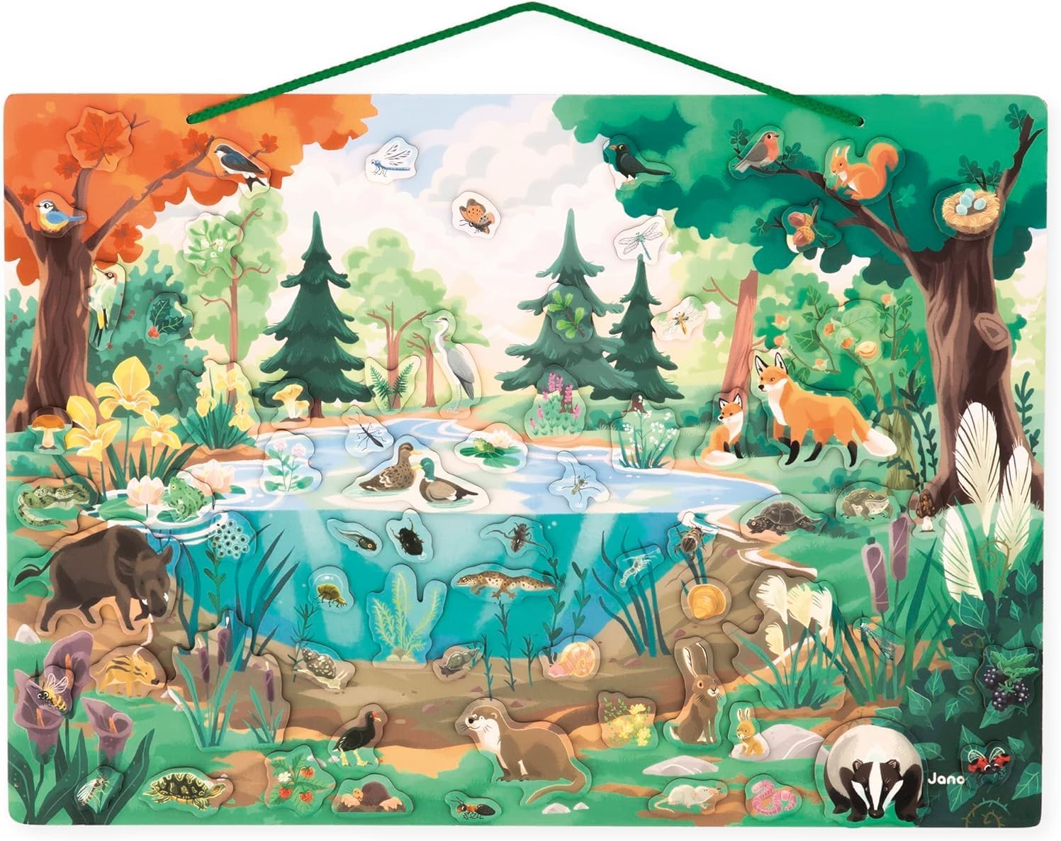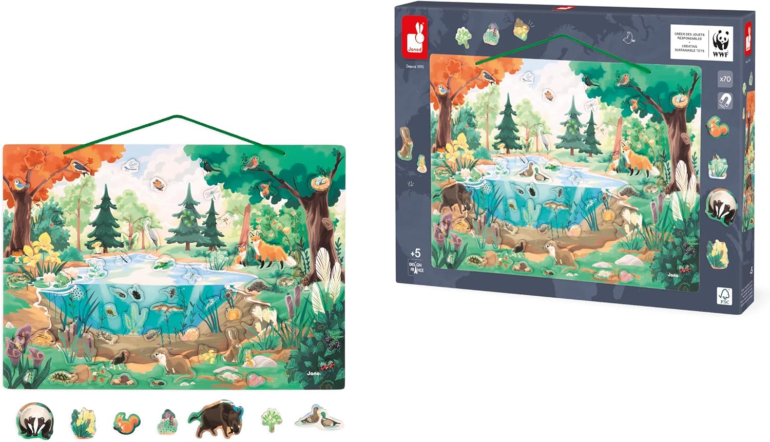• EINE SCHÖNE MAGNETISCHE TAFEL: Dieses Lernpuzzle besteht aus einer Tafel mit 70 Magneten zum Thema Teich und Wald. Legen Sie die Janod-Tafel hin oder hängen Sie sie mit der Schnur auf - zum Spielen im Stehen oder als Kinderzimmer-Deko.