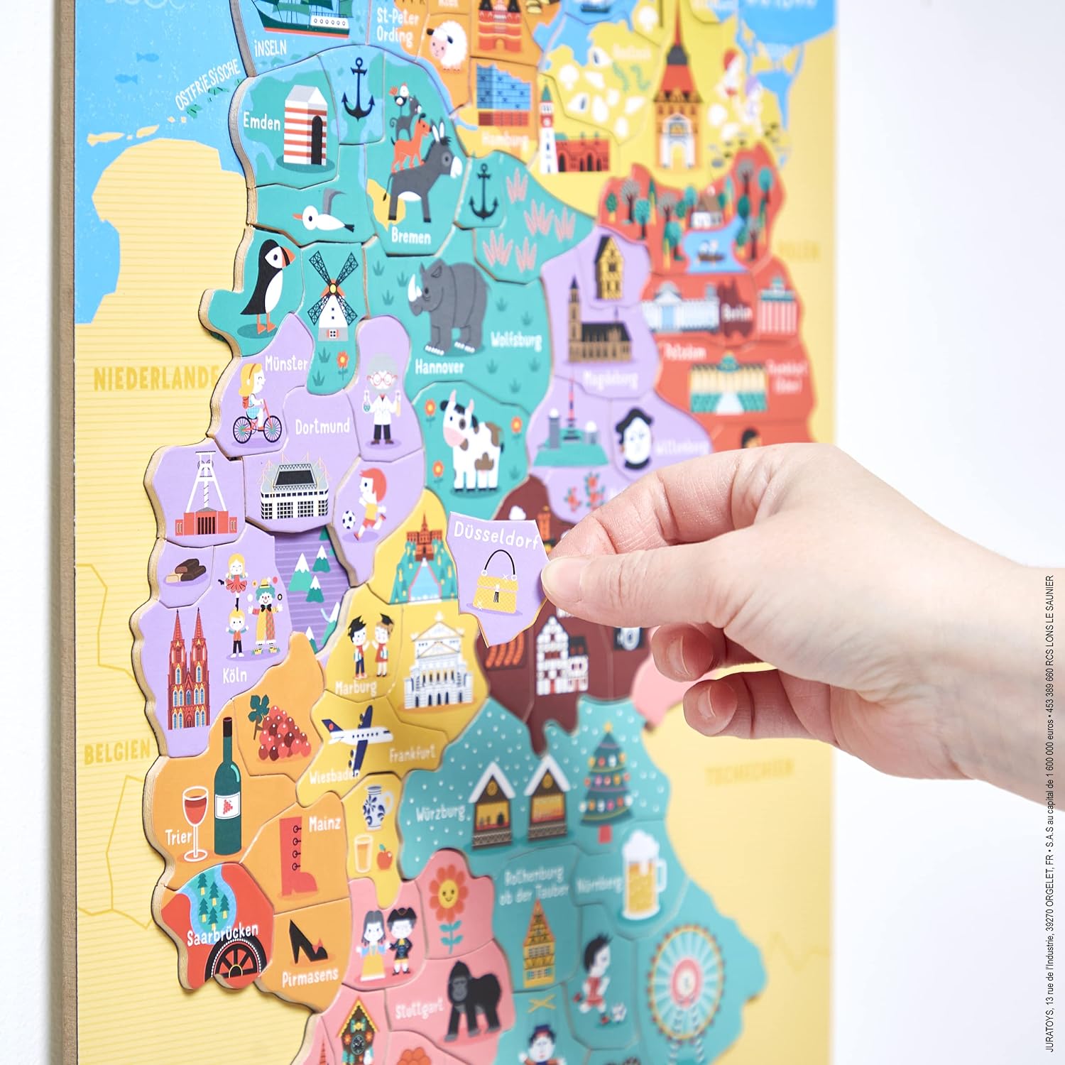 • SPIELEND LERNEN : Auf dem Weg zu einer Reise durch Deutschland voller Überraschungen. Indem man die 79 Teile dieses Puzzles aus Holz mit den Massen 30 x 40 cm an ihren Platz setzt, erhält man eine tolle Deutschlandkarte, die man einfach an der Wand