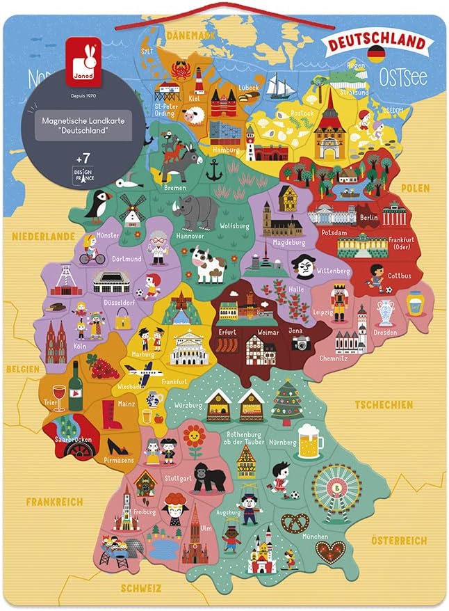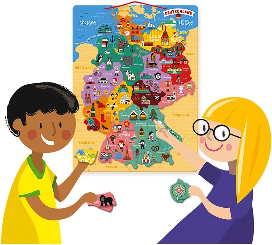 • PUZZLE DEUTSCHLANDKARTE : Jedes Teil stellt eine deutsche Region dar, mit ihrem Namen, ihrer Hauptstadt und Illustrationen von lokalen Spezialitäten und touristischen Sehenswürdigkeiten. Die magnetische Unterlage stellt Italien mit seinen Regionen,