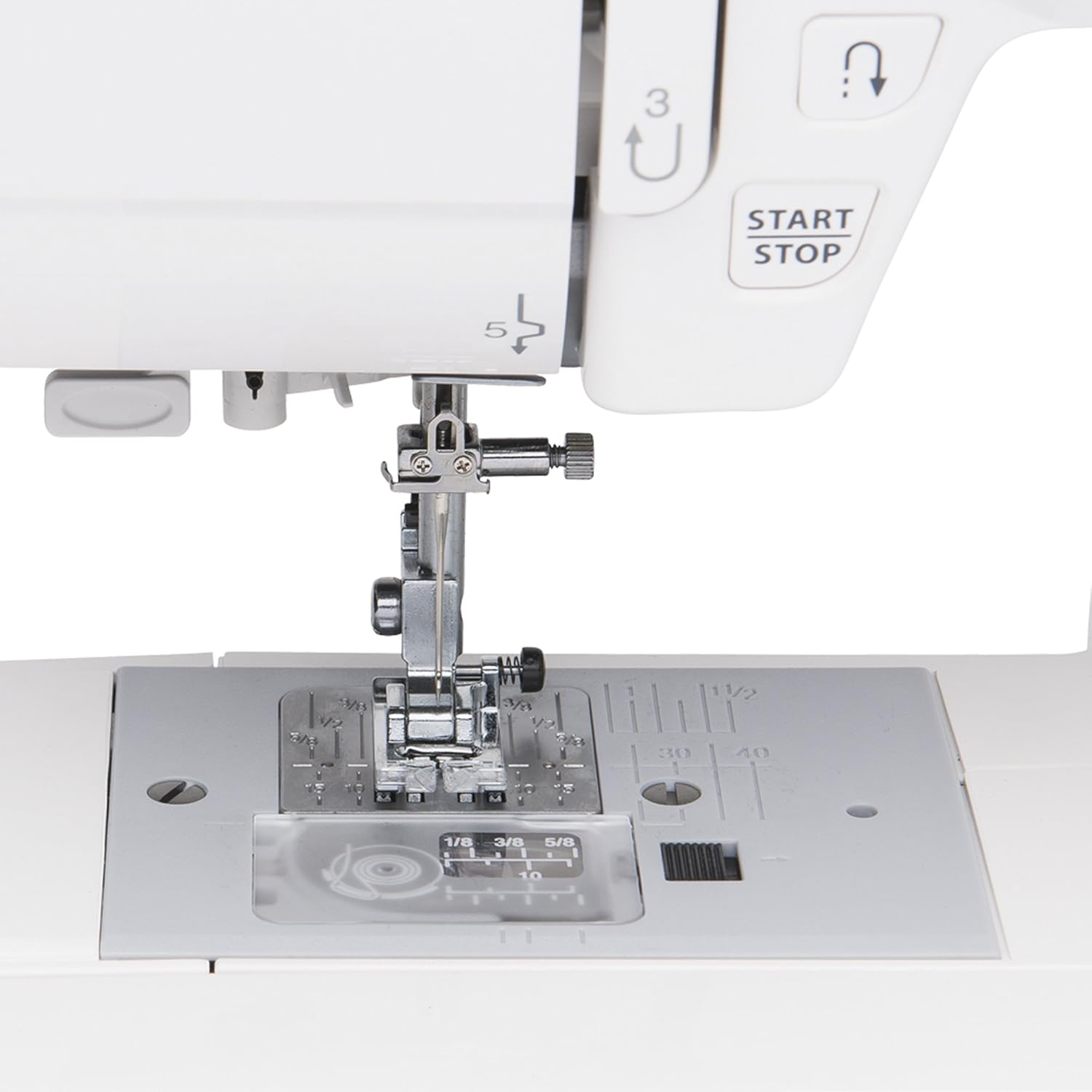 - Praktische Tasten wie Start/Stopp-Taste, Rückwärtsgang, Verriegelungsstich und Nadel hoch/runter