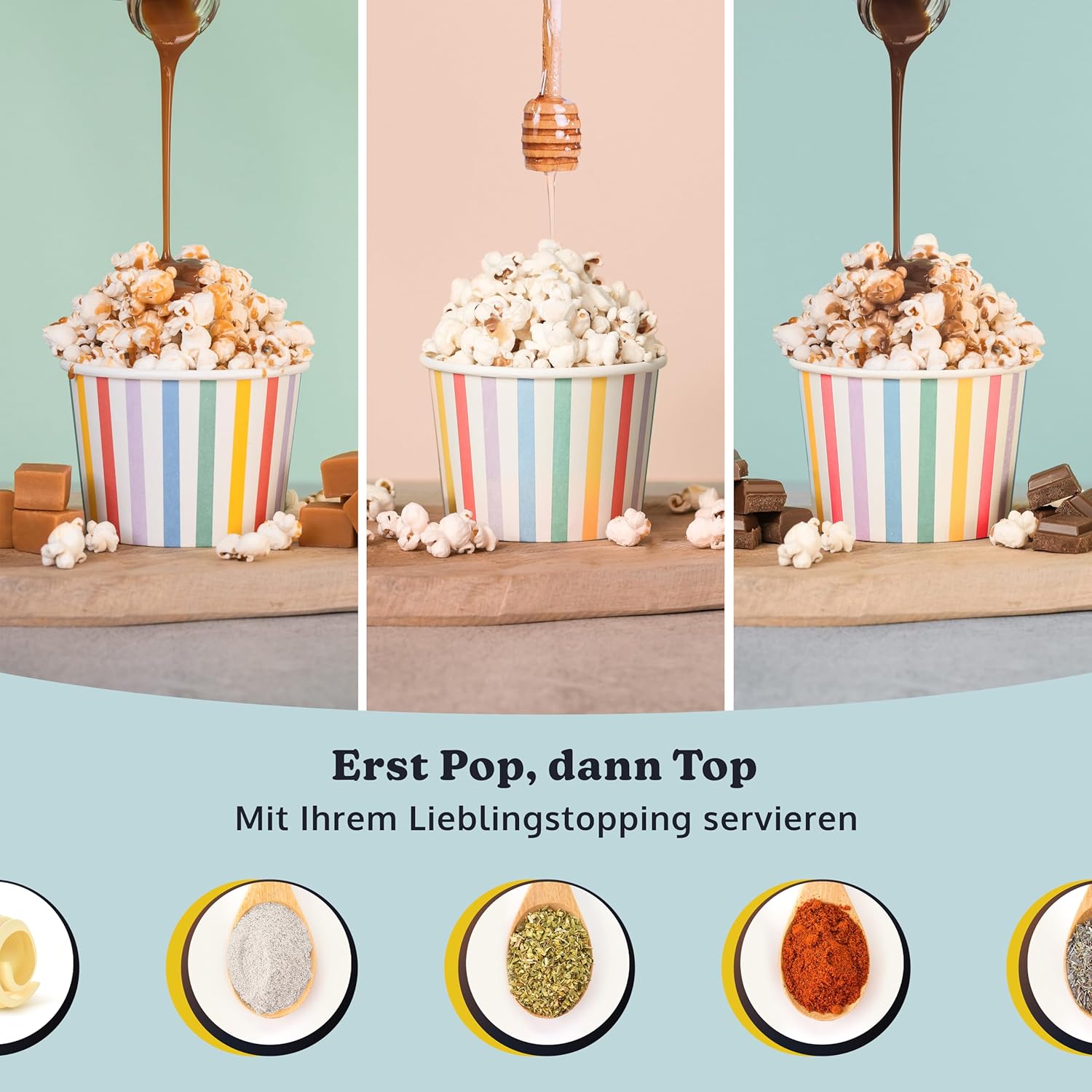 - Anpassbare Aromen: Erweitern Sie Ihr Popcorn-Erlebnis mit unzähligen Geschmacksmöglichkeiten. Egal, ob Sie klassisches Butterpopcorn, süssen Karamell, herzhaften Käse oder experimentelle Kombinationen bevorzugen, Sie können ganz einfach Ihre
