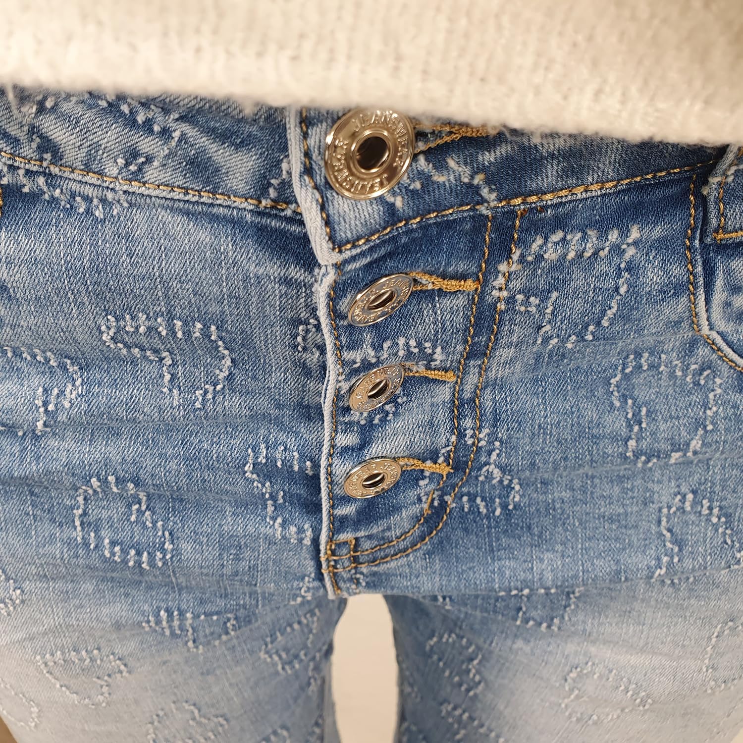 - Nehmt eine gutsitzende Jeans von Euch und messt sie aus und vergleicht sie mit den angegebenen Zentimeterwerten in der Grössentabellen um unnötige Retouren zu vermeiden Das Model auf den Produktbildern trägt die Grösse S/36