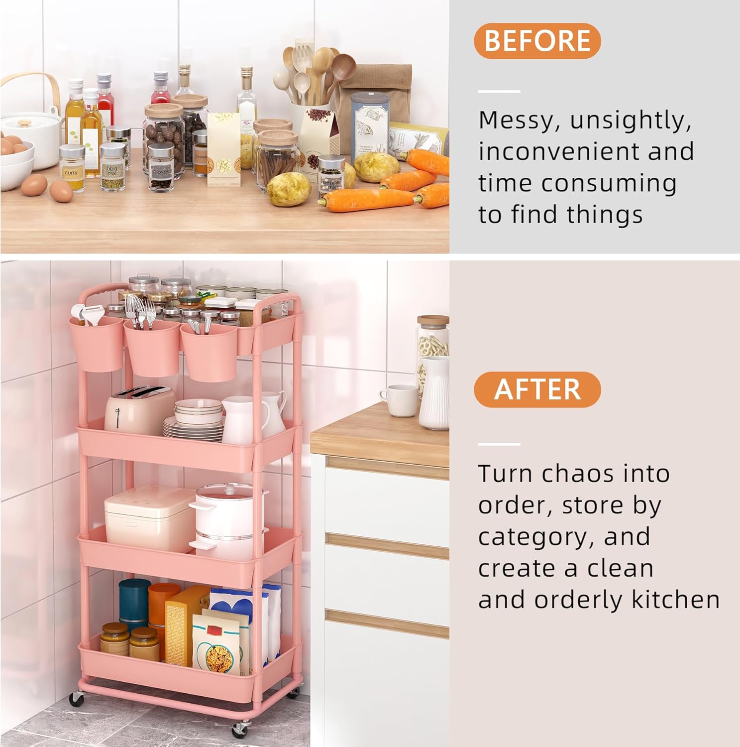 - Praktisches Design: Der Aufbewahrungswagen hat drei zusätzliche Kunststoffbecher, die verwendet werden können, um kleine Gegenstände wie Messer, Gabeln, Kaugummi, Schlüssel usw. zu halten. Es gibt zwei Griffe auf der oberen Ablage, mit denen Sie den