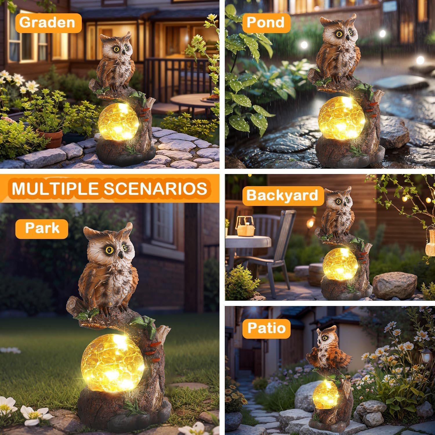 • 【Einfach zu bedienen】Geniessen Sie die Schönheit von Outdoor Eule Gartenstatuen mit dem Komfort von solarbetriebenen Lampen. Schalten Sie die Eulen einfach ein und lassen Sie sie tagsüber in der "ON"-Position. Das Solarmodul wird tagsüber