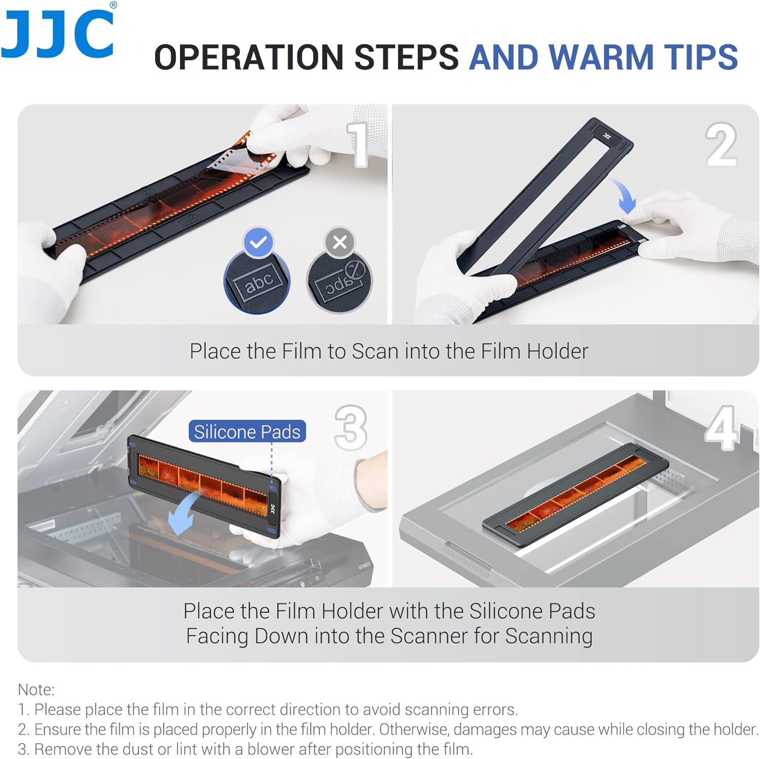 - Hinweis: Legen Sie die 35-mm-Filme mit der gleichen Position wie abgebildet "ABC" auf die Halterung; platzieren Sie die "JJC"-Markenseite zum Scanner, um das korrekte Scannen zu erhalten