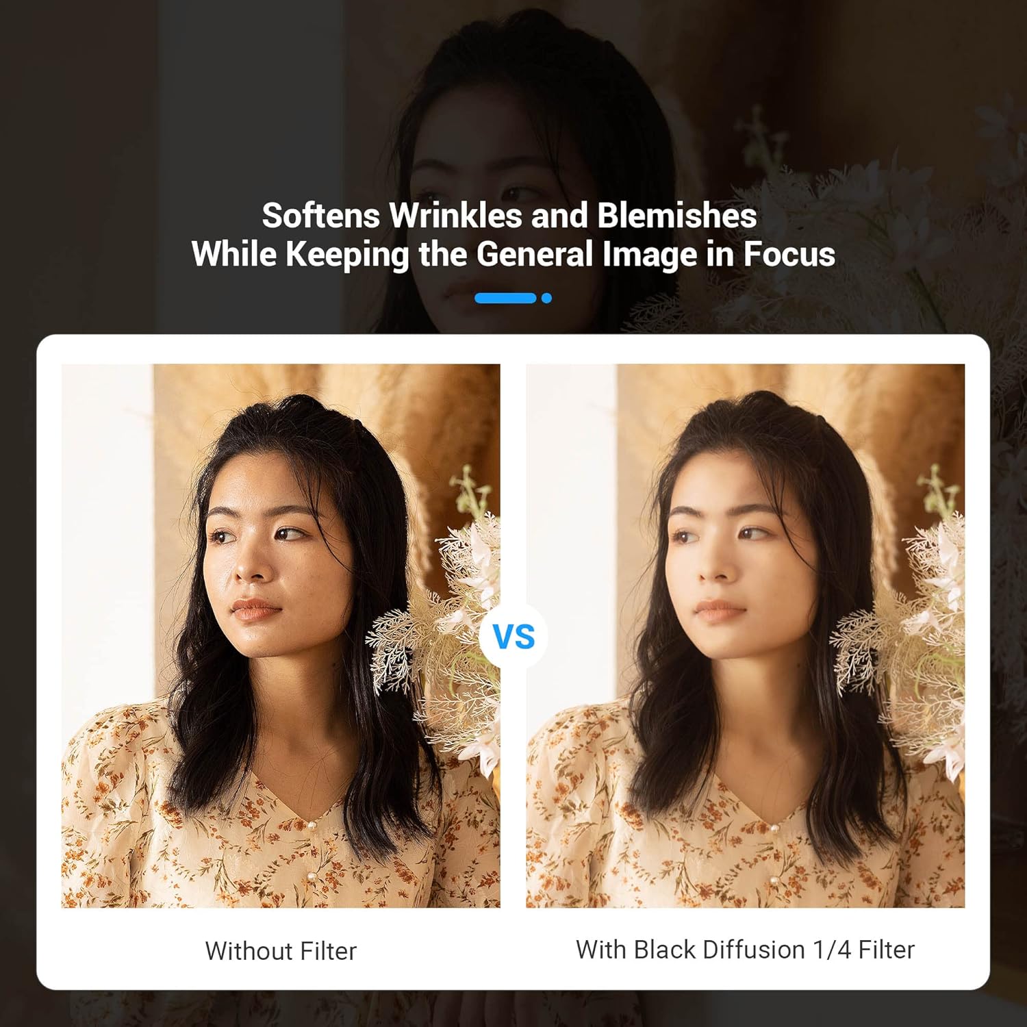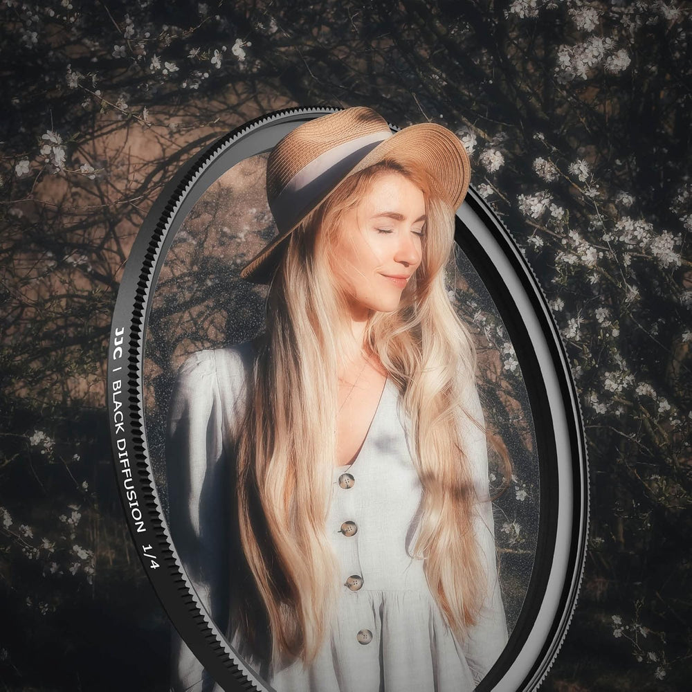 - 【Professioneller Porträtfotografie-Filter】 Der 1/4-Schwarzdiffusionsfilter kann den Kontrast von Glanzlichtern und Schatten unterdrücken und einen leicht reduzierten perlmuttartigen Halo um Glanzlichter erzeugen, wodurch Gesichtsfalten, Flecken,