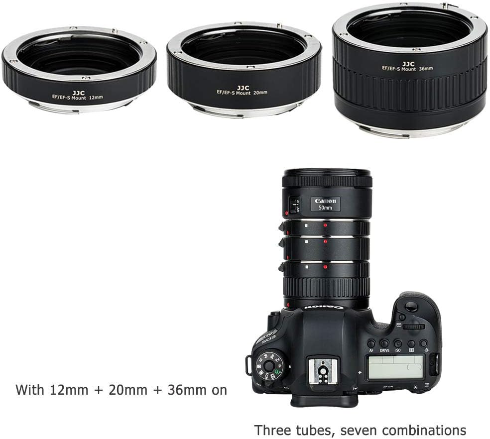 - 12 mm, 20 mm und 36 mm Autofokus (AF) Verlängerungsrohr-Set für Canon EF/EF-S Mount Kamera und Objektiv – kann einzeln oder in Kombination (mit 7 verschiedenen Möglichkeiten) verwendet werden, um Ihre gewünschten Makrofotografie oder Nahaufnahmen