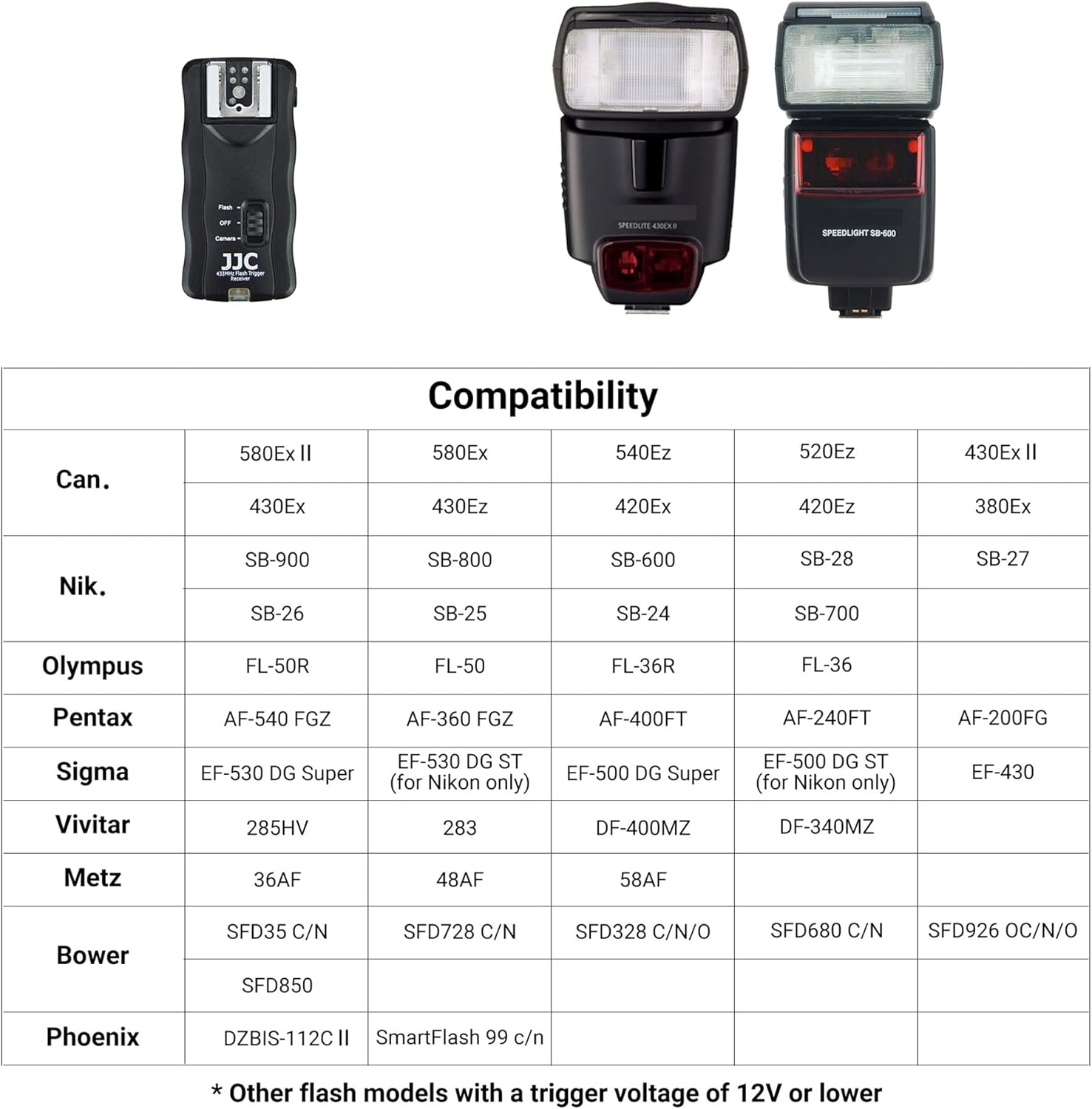 - Empfängeranzüge für Blitz wie Canon 600EX 600EXII 580EX II 580EX 540EZ 520EZ 430EX II 430EX 430EZ 420EX 420EZ 380EX Nikon SB-910 SB-900 SB-800 SB-600, SB-28, SB-27, SB-26 und Olympus Pentax Sigma Metz speedlite.Bitte überprüfen Sie die folgende
