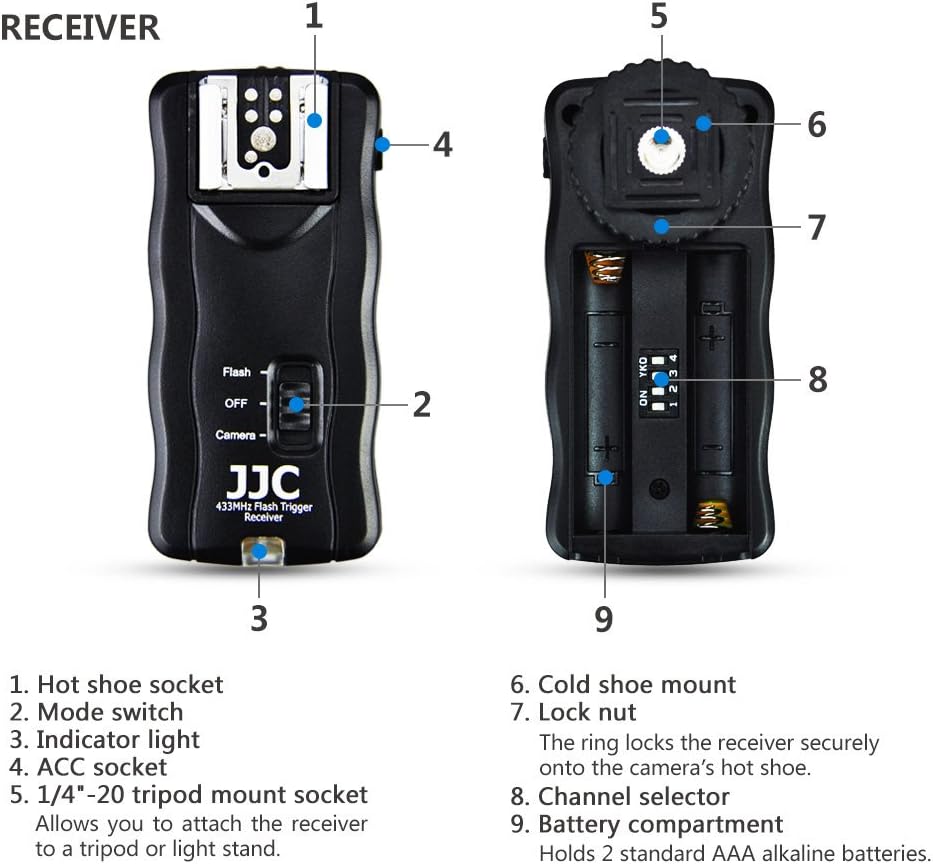 - JJC-Blitzauslöser ist ein drahtloser Fernauslöser sowie ein multifunktionaler Blitzauslöser, der synchron Blitze Speedlite und Studio-Blitze auslösen kann. Unterstützt das gleichzeitige Blitzen mehrerer Blitze.