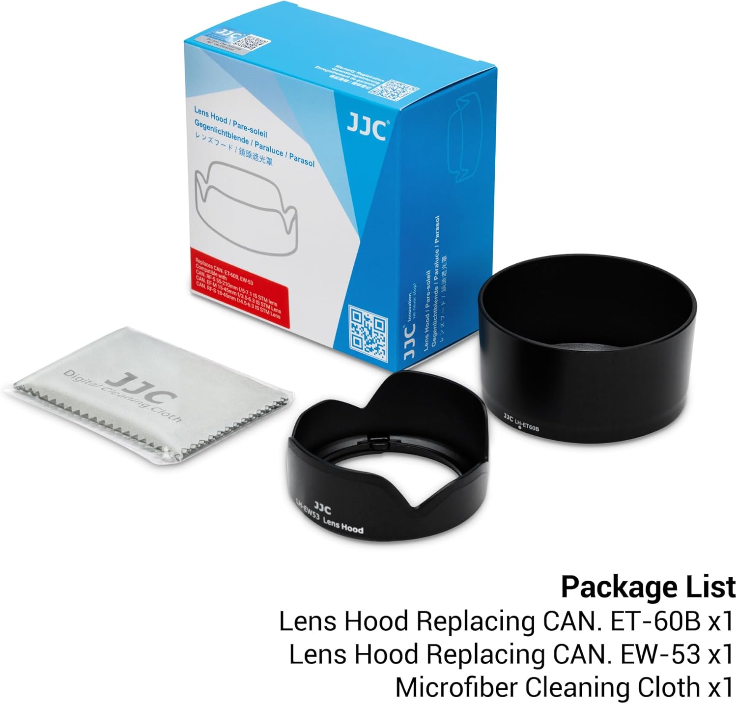 - JJC Gegenlichtblenden und Mikrofaser-Reinigungstuch-Set: Beinhaltet 2 Stück Gegenlichtblenden (EW-53 Gegenlichtblende + ET-60B Gegenlichtblende) und ein Stück Mikrofaser-Reinigungstuch.