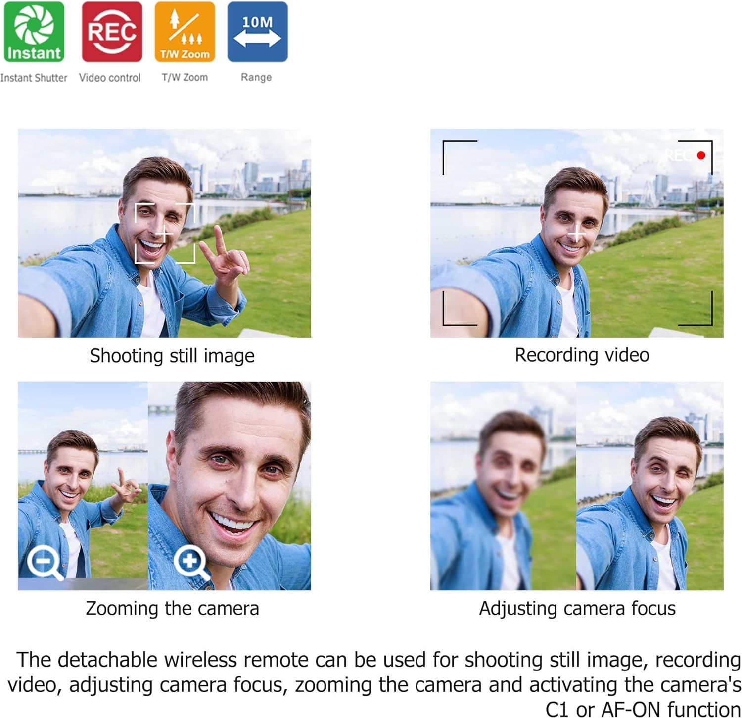 - Multifunktion: (1) Aufnehmen von Standbildern (2) Aufnehmen von Videos (3) Einstellen des Kamerafokus (4)Zoomen der Kamera (5)Aktivieren der C1- oder AF-ON-Funktion der Kamera. "LOCK" All the Buttons Funktion: Deaktivieren Sie alle Tasten der